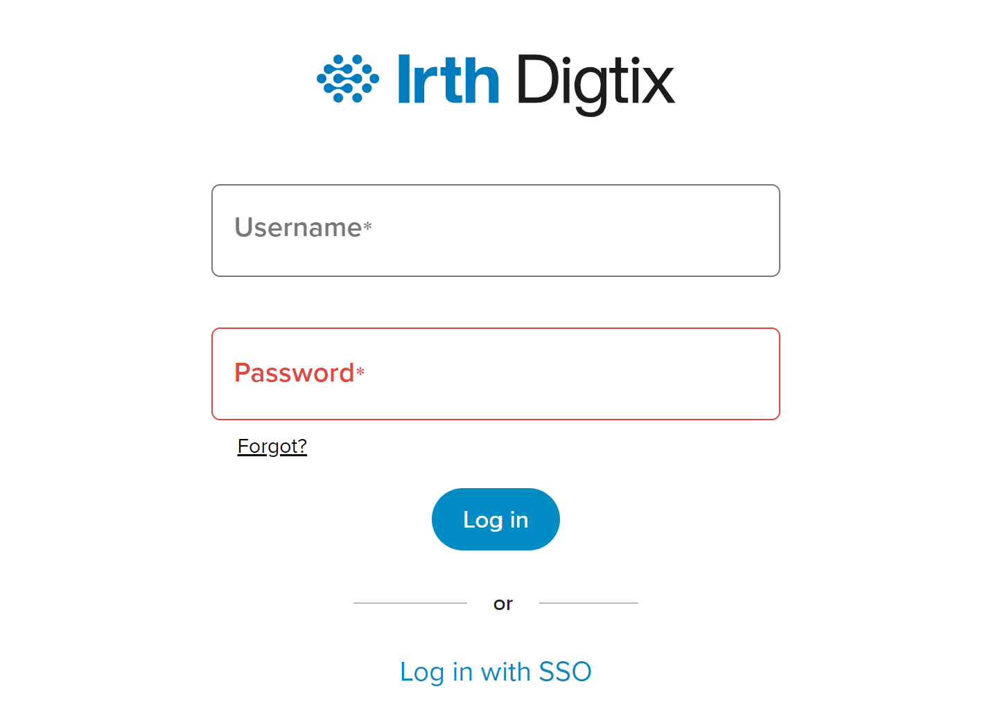 To login to your Digtix account, navigate your web browser to your company’s Digtix home page and enter your username and password; then, click login. Users with single sign-on access will click the Log in with SSO link toward the bottom of the login screen.