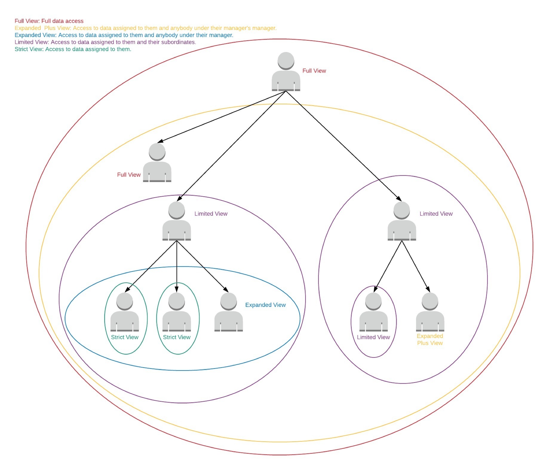 - Expanded Plus View: Access expands further up and across the hierarchy (manager’s peers and their teams)