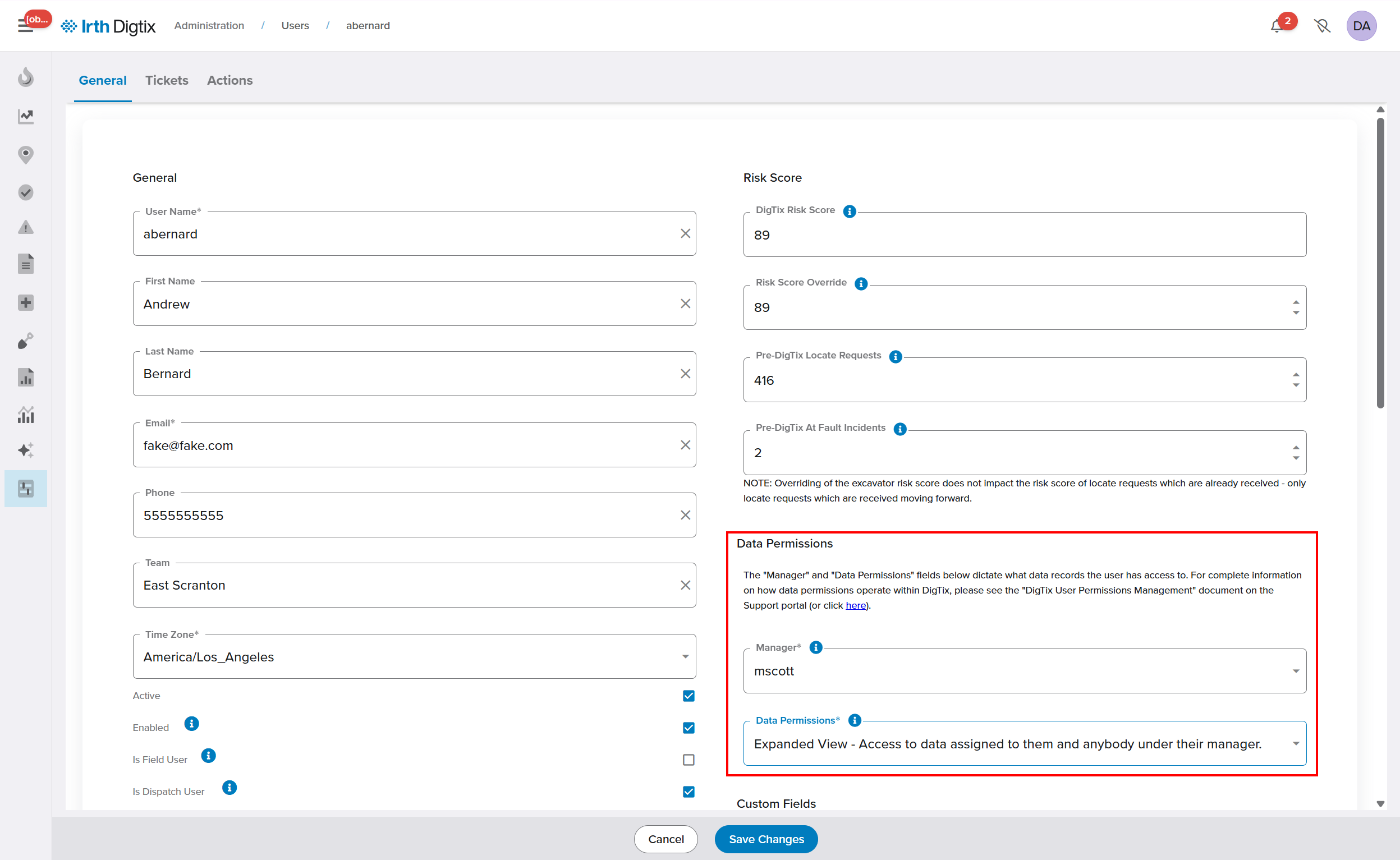 - Assign a Manager and Data Permissions from the dropdown menus, then Save Changes