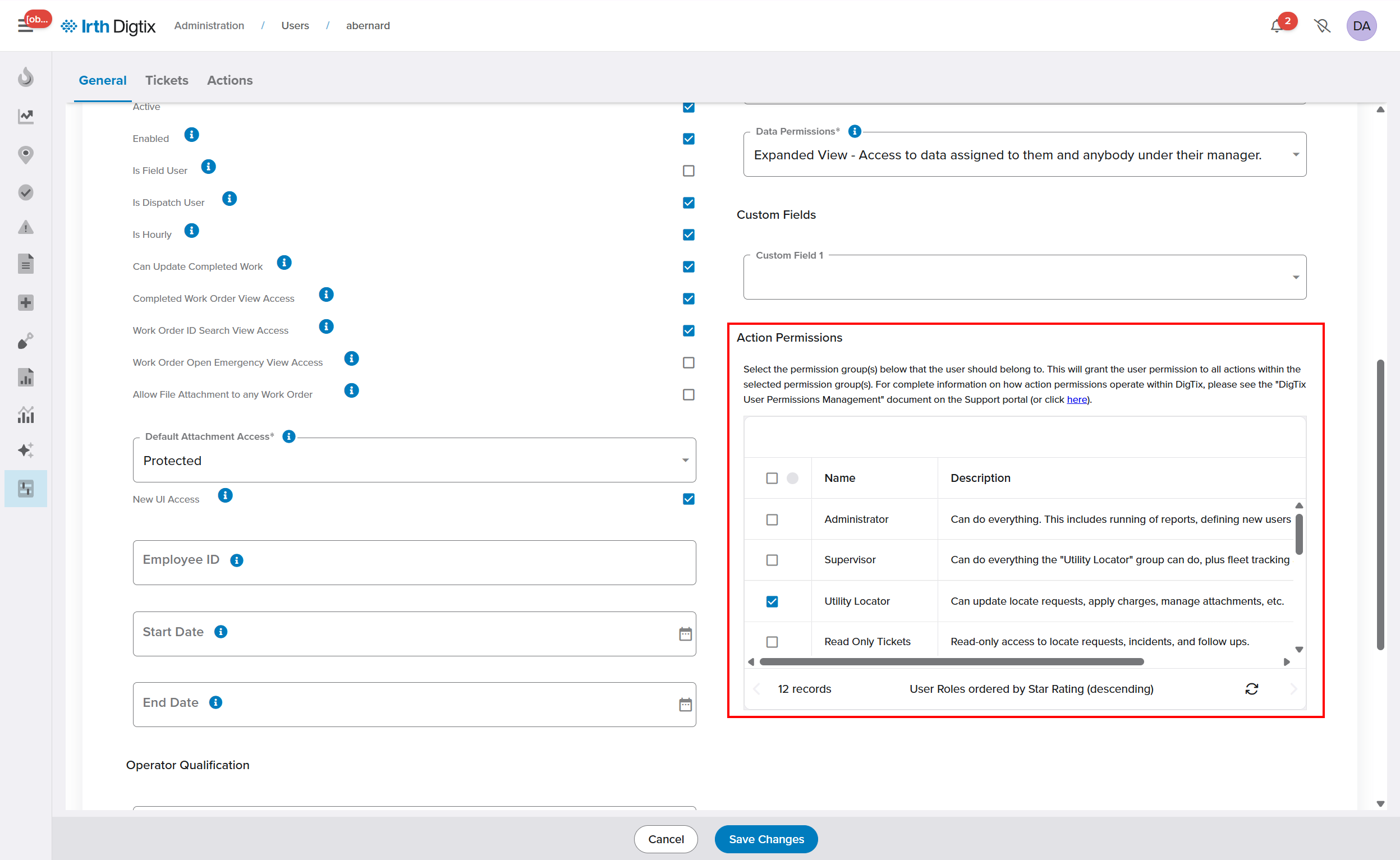 - Grant or revoke specific Digtix actions as needed, then Save Changes