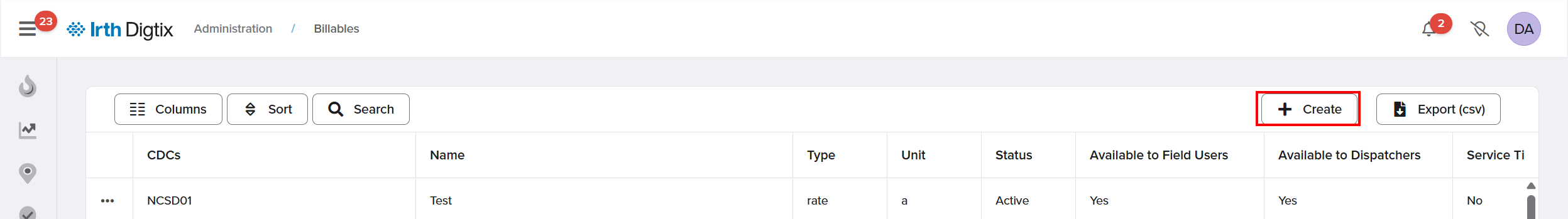 2. Click +Create to add a new billable.