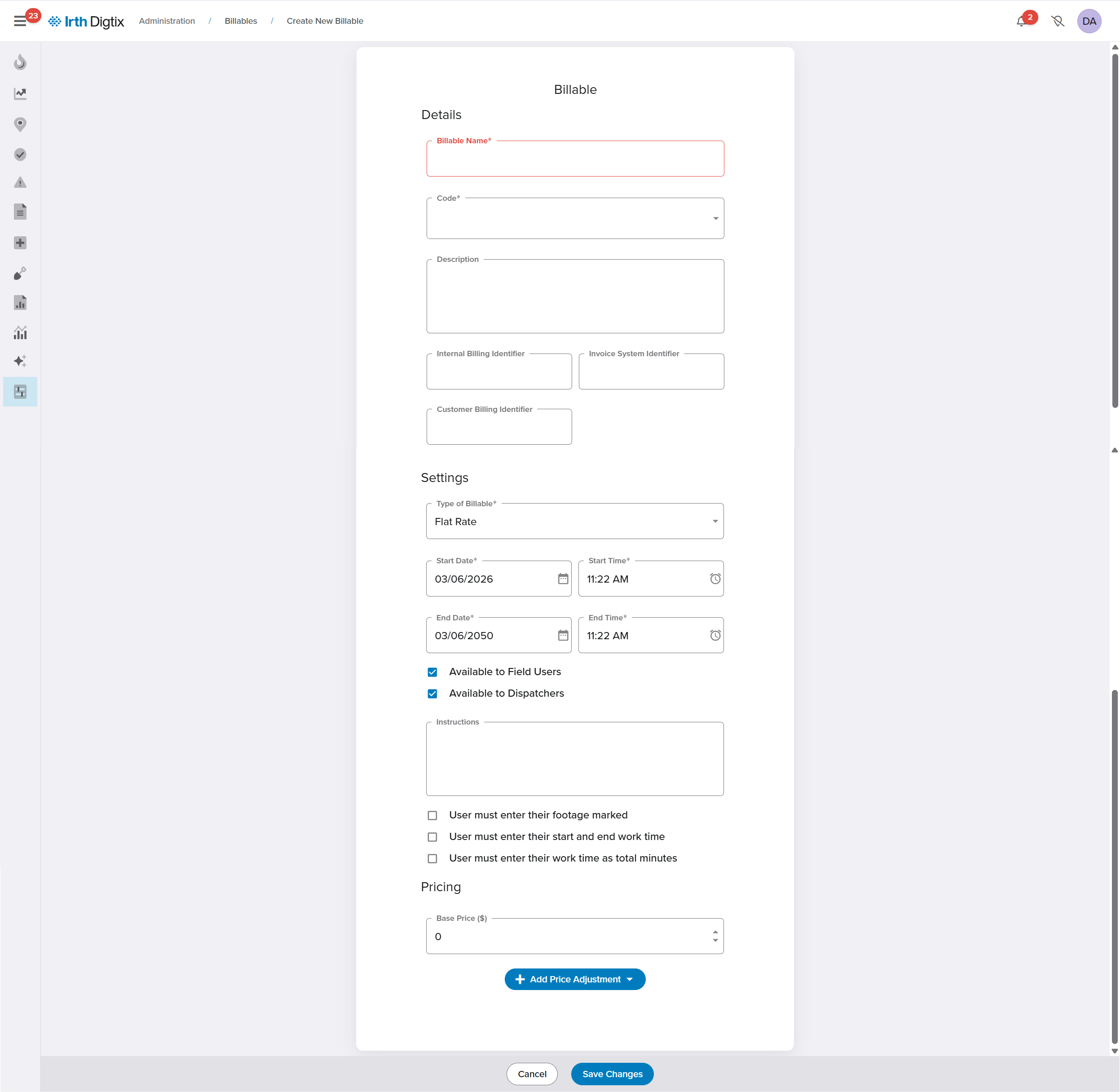 • Historical Integrity: Once a billable’s start date has passed, certain fields can no longer be edited. This protects historical billing data.