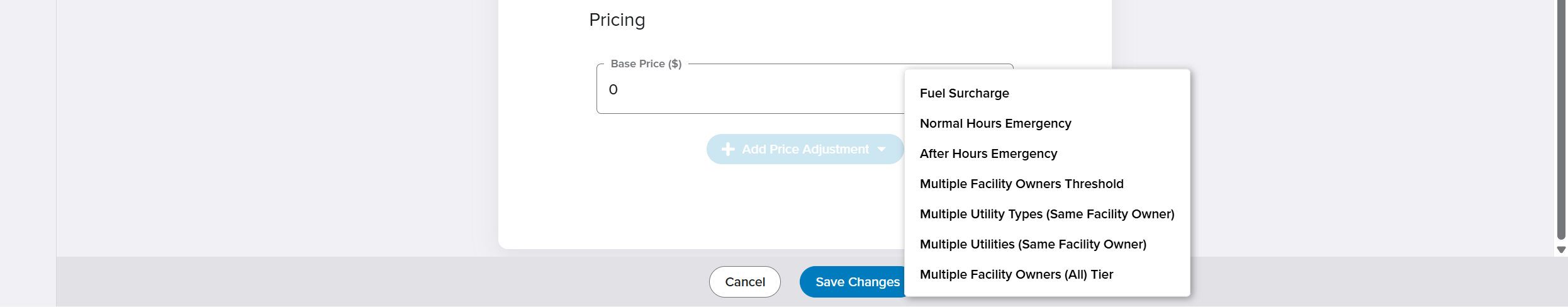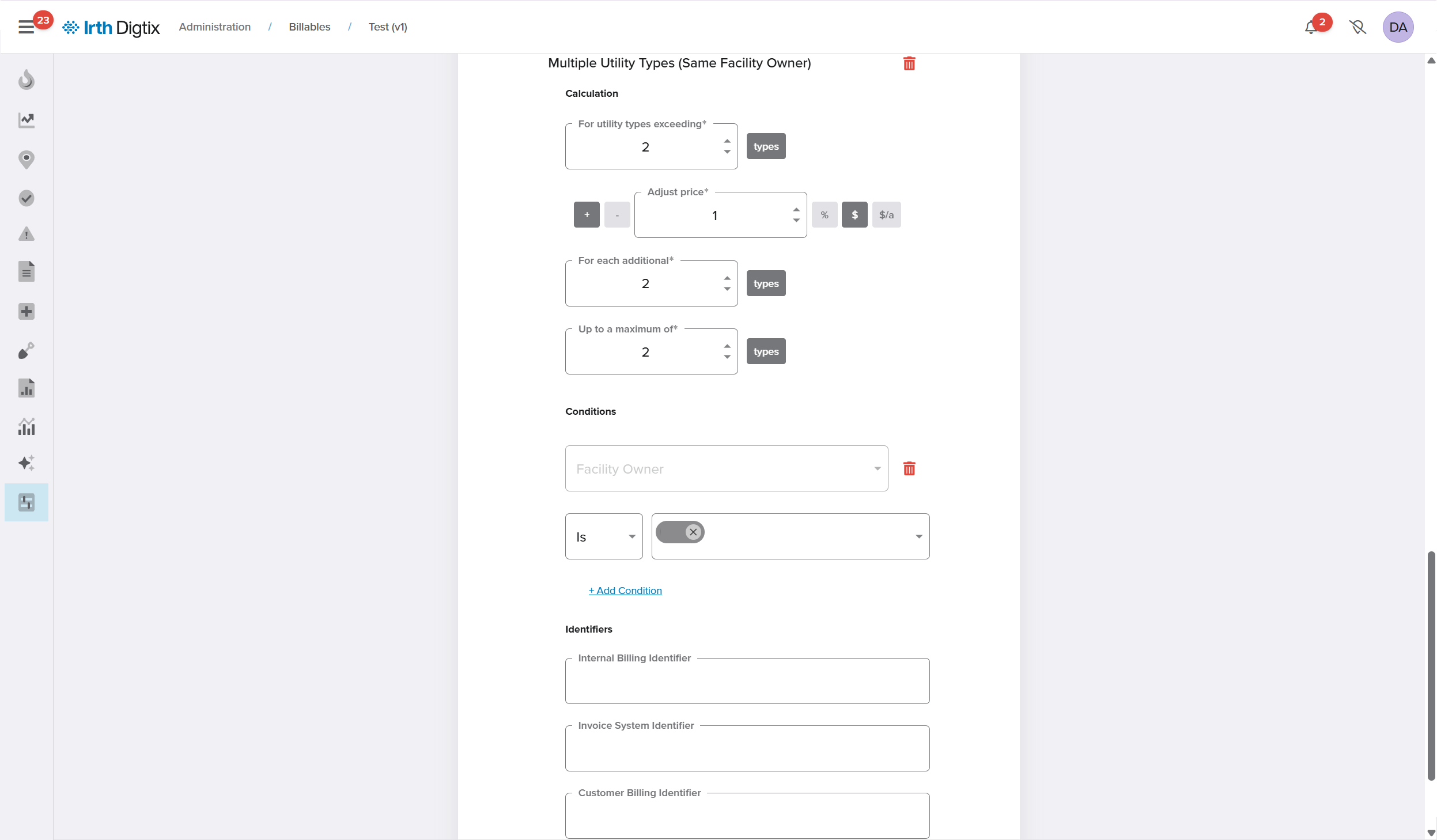 • Applies pricing changes based on how many utilities, utility types, or facility owners are present.