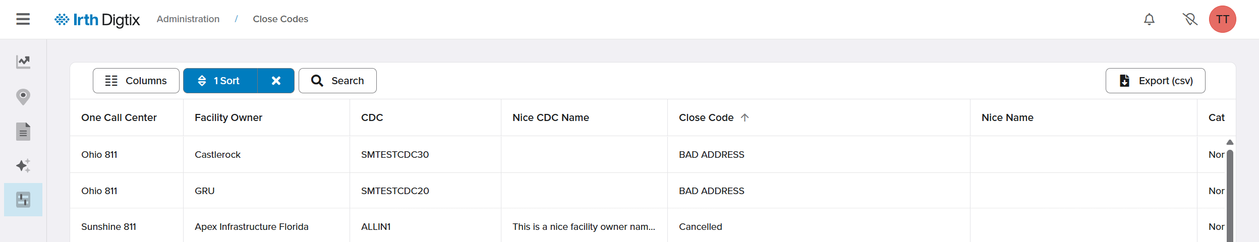 Close Codes appear in a table where each entry represents a single configured close code for a specific CDC. Double-click a Close Code to view or change its configuration.