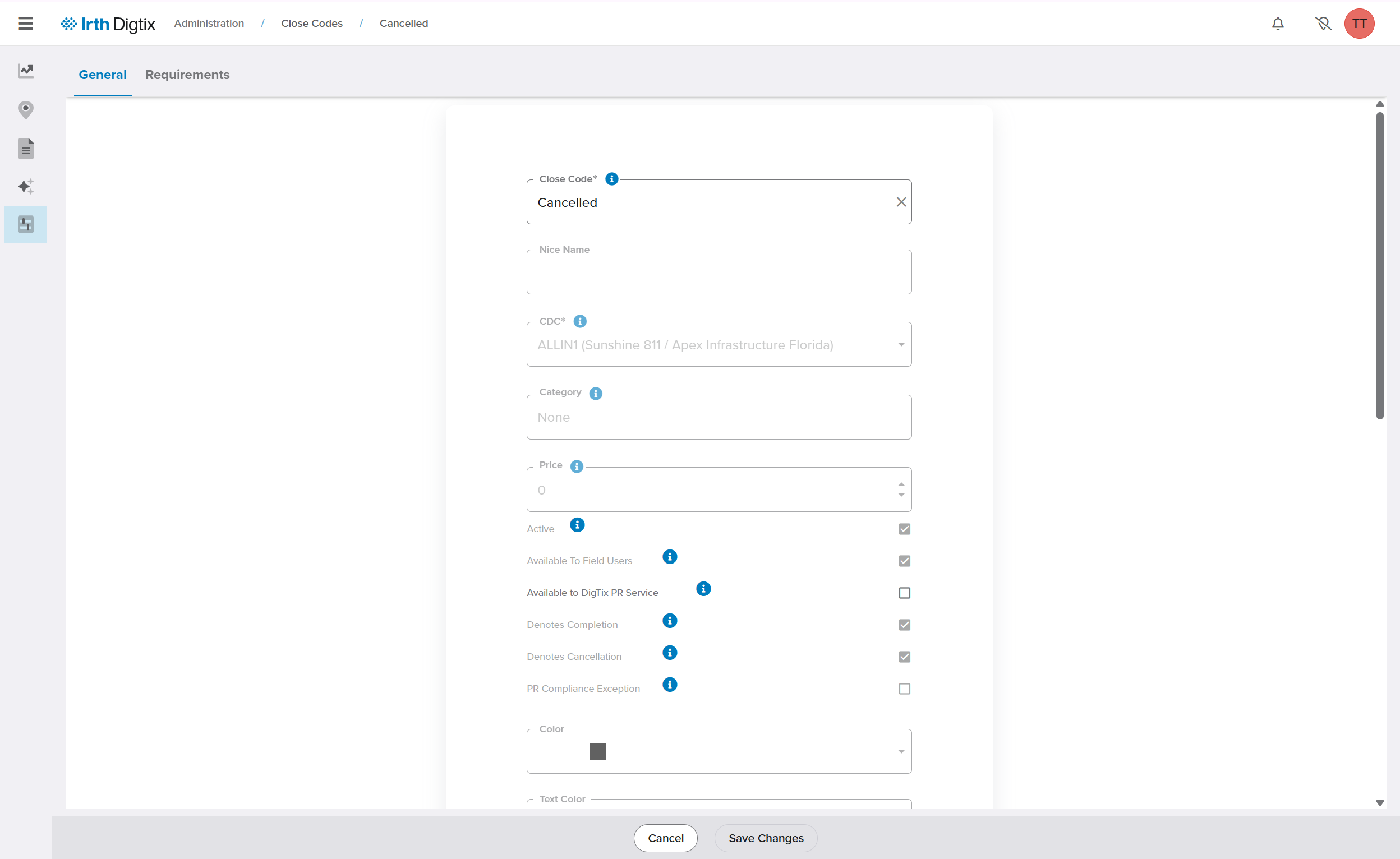 Permissions: Close Code configuration is available to users with administrative access to Digtix.