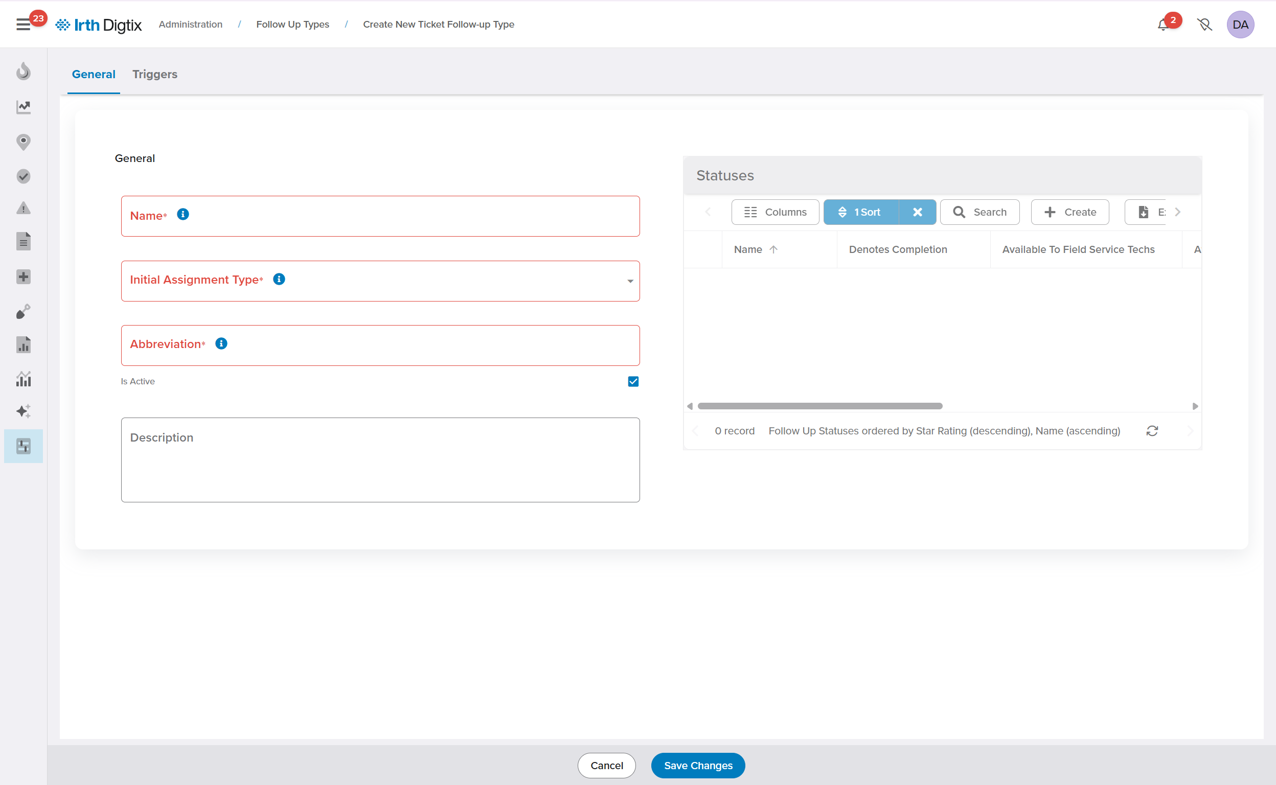- Required statuses: All follow‑up types must include Unassigned, Pending, and Cancelled statuses