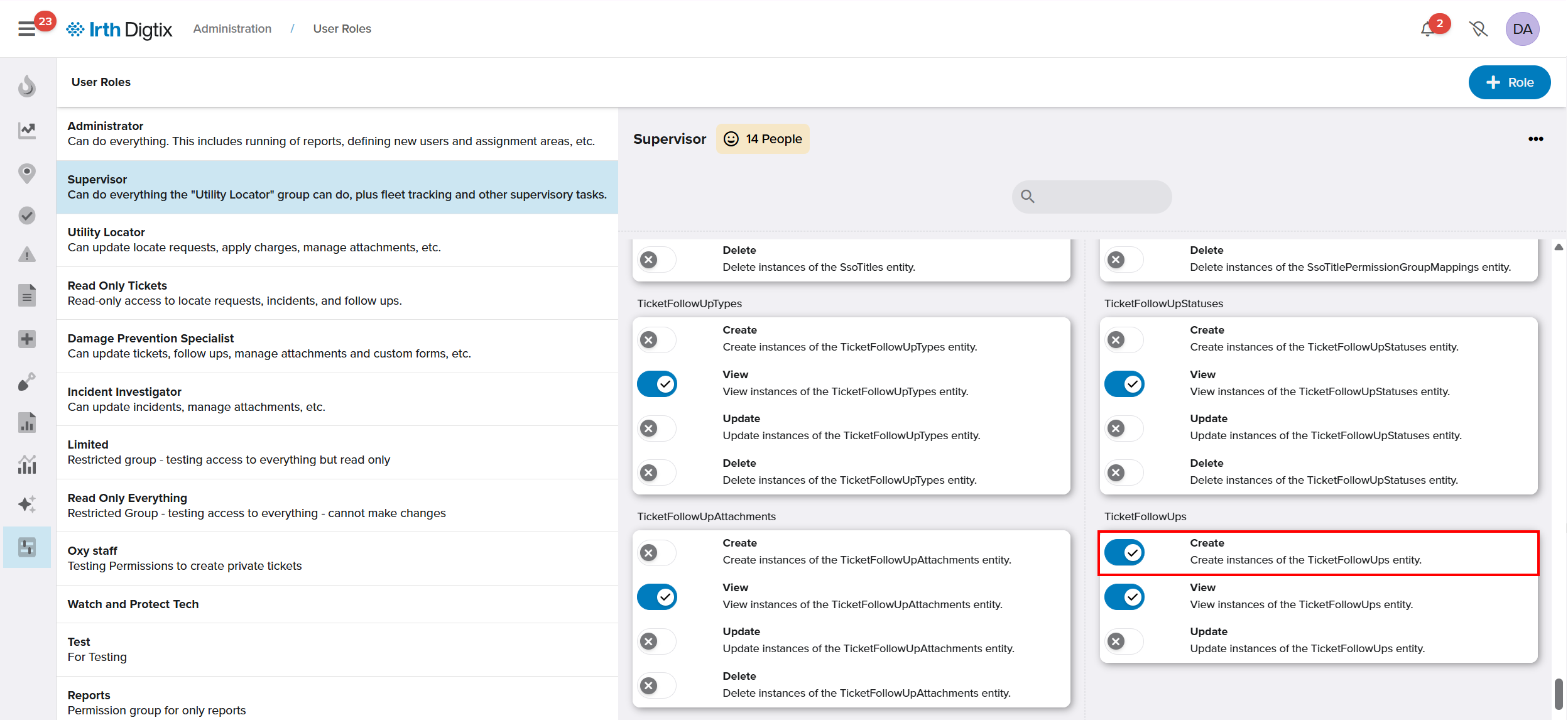 The ability to trigger follow-ups from locate requests is granted or revoked by the Ticket Follow Ups > Create toggle.