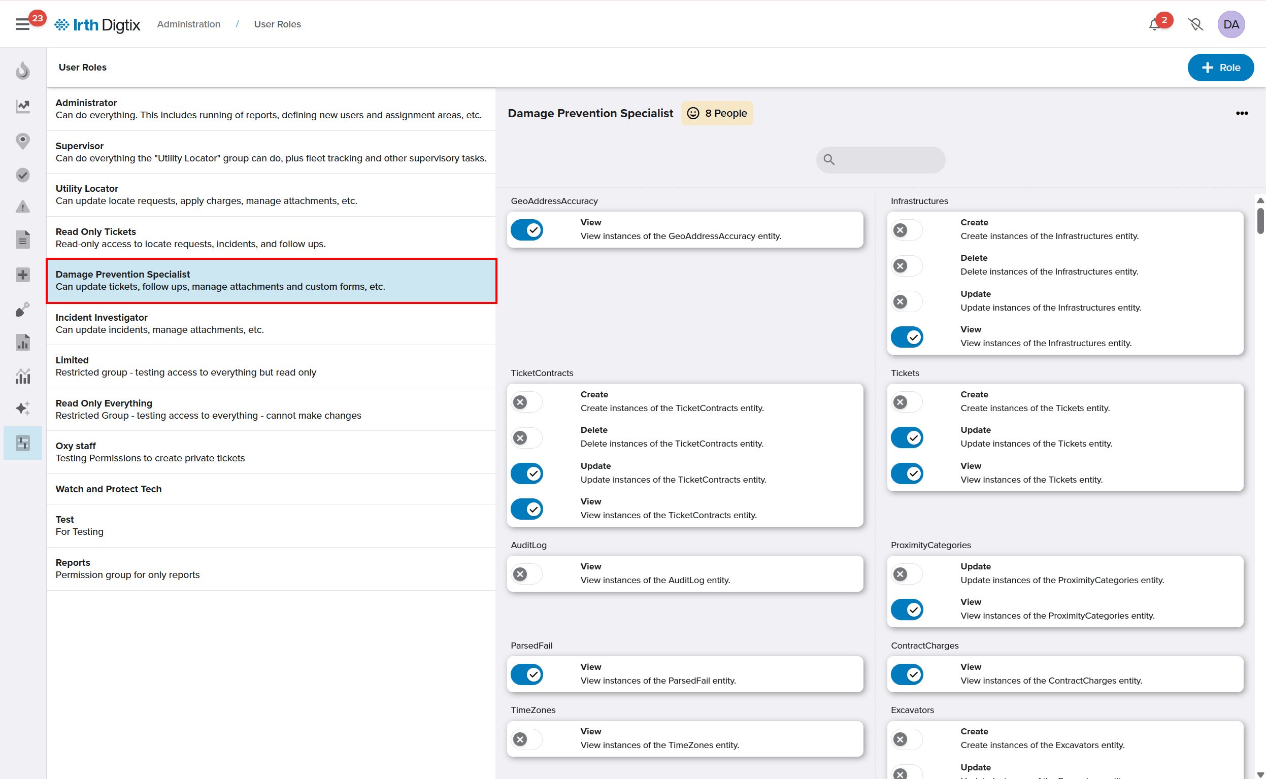 - Completion permissions are granted by default to the Damage Prevention Specialist role.