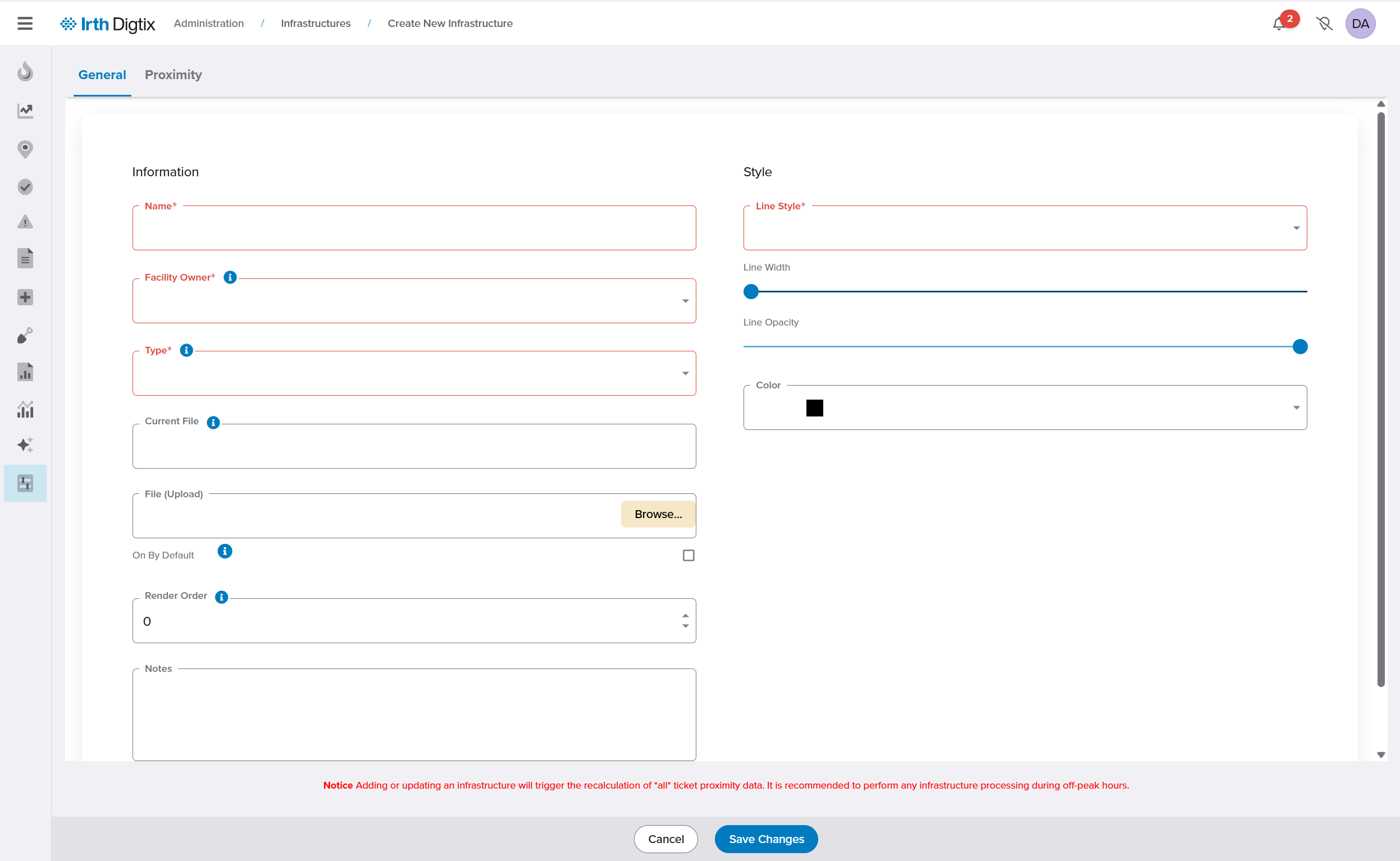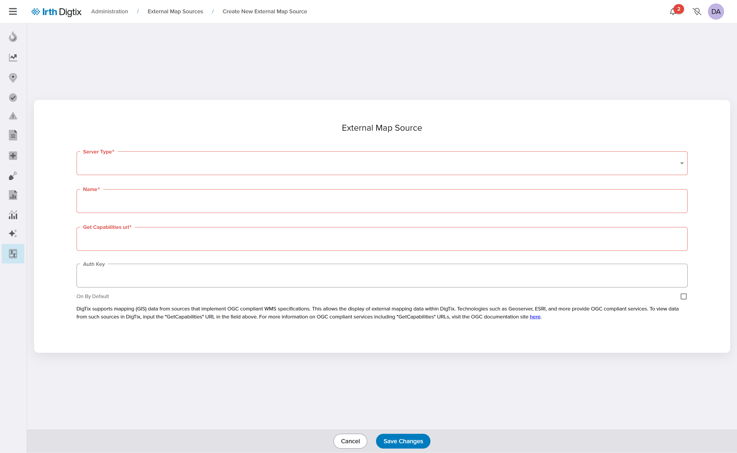 Permissions: Administrative access is required to create, edit, or delete infrastructure layers and external map sources.