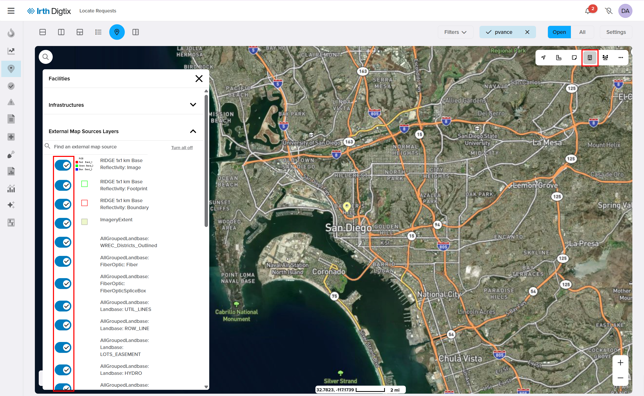 - Open a map view, select the Show Facilities icon, and toggle the desired layers on or off.