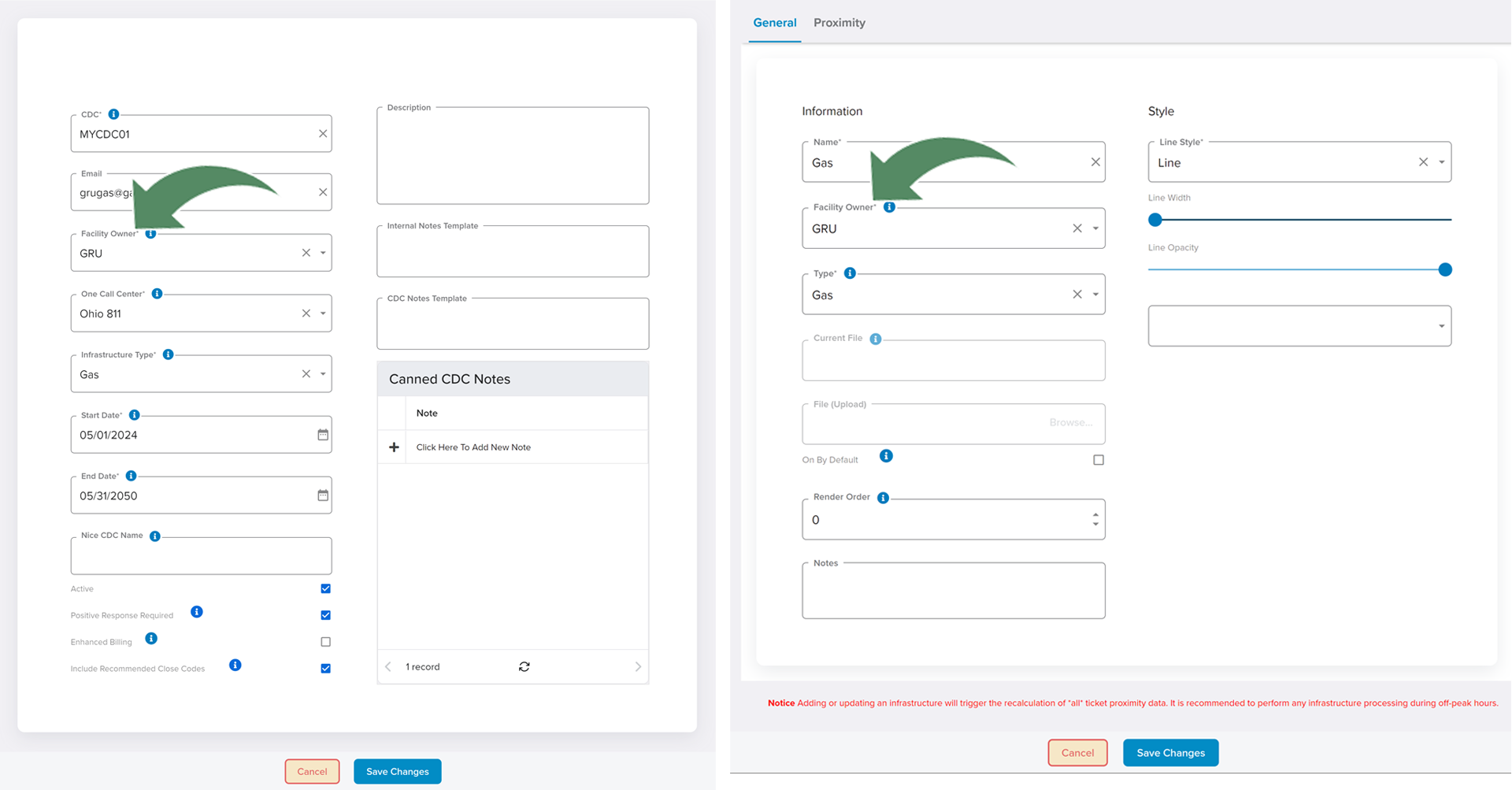 Only the infrastructure layers that belong to the same Facility Owner as the CDC of the locate request are considered for each ticket. For example, a locate request for utilities belonging to "ABC Communications" will not have its proximity calculated to infrastructures belonging to "ACME Gas and Electric".