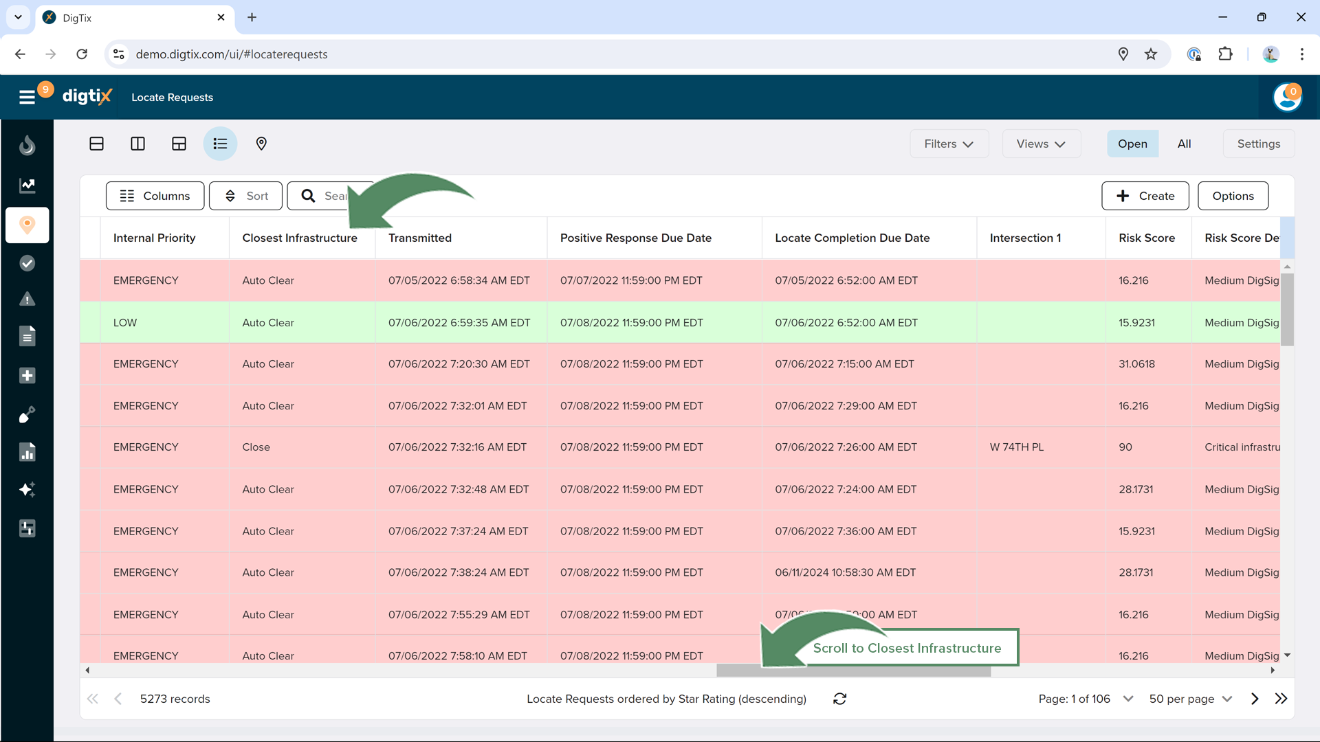 Within the ticket grid, the closest proximity category is displayed in the "Closest Infrastructure" field. For example, if a ticket involves two CDCs and one is a "Far" proximity category and the other is a "Medium" proximity category, this field will be "Medium".