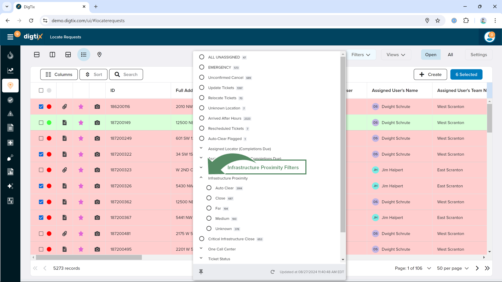 As with most grid columns in Digtix, this "Closest Infrastructure" field may be sorted, filtered, hidden, shown, and exported. The "Filters" panel to the left of the ticket grid provides a way to quickly filter tickets based on their closest infrastructure. Expand the "Infrastructure Proximity" folder to select which category you'd like to view.