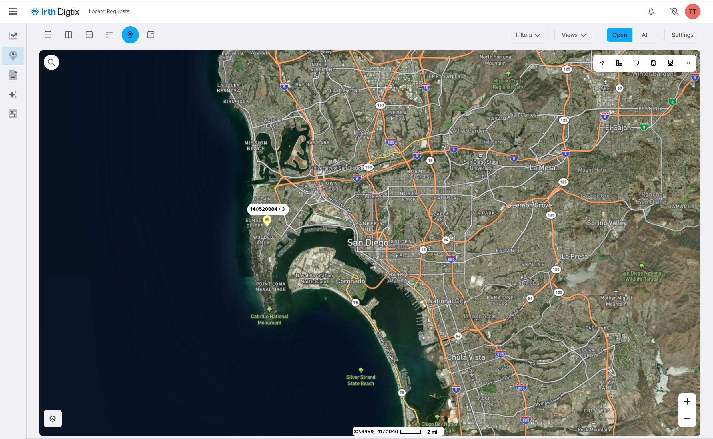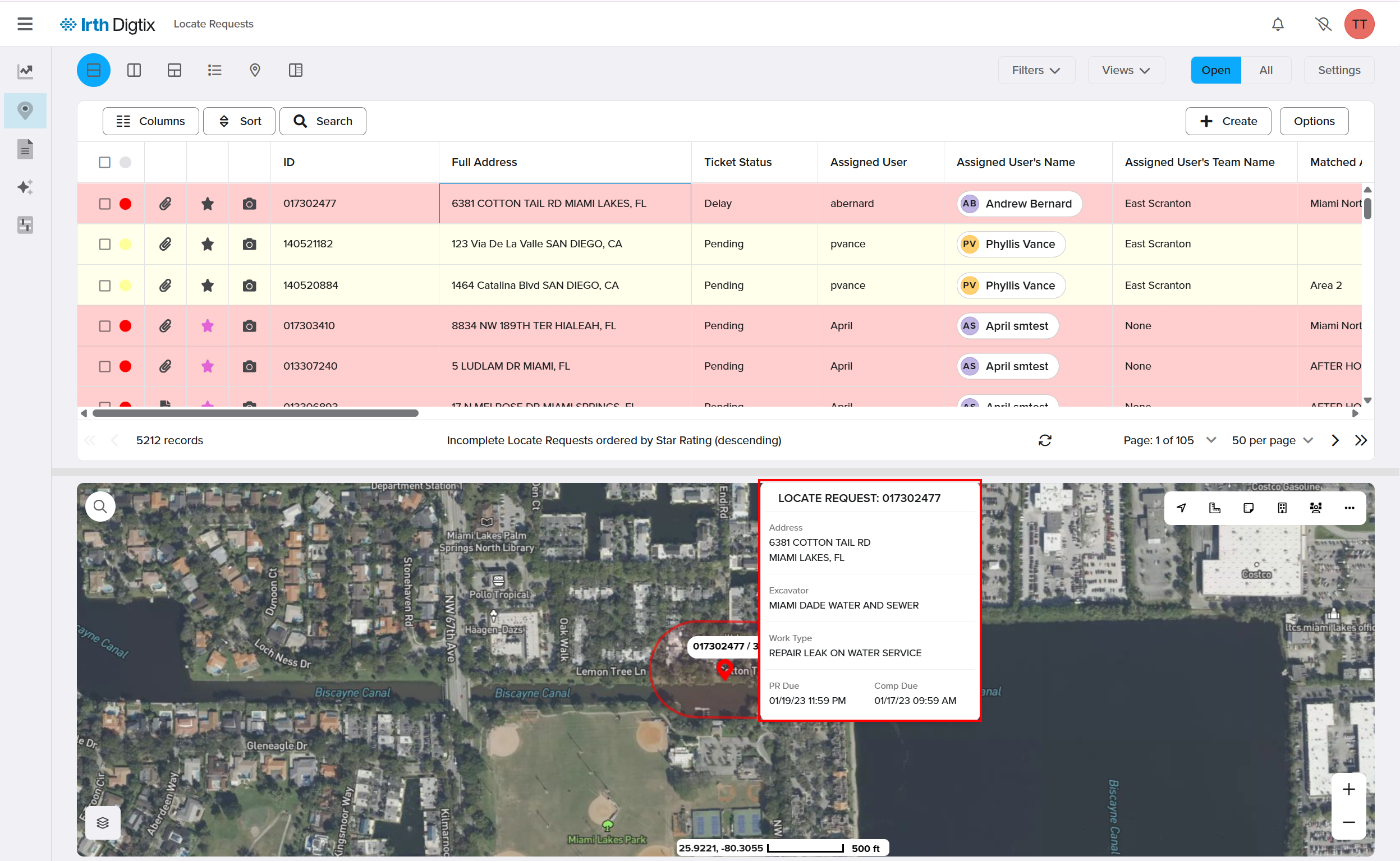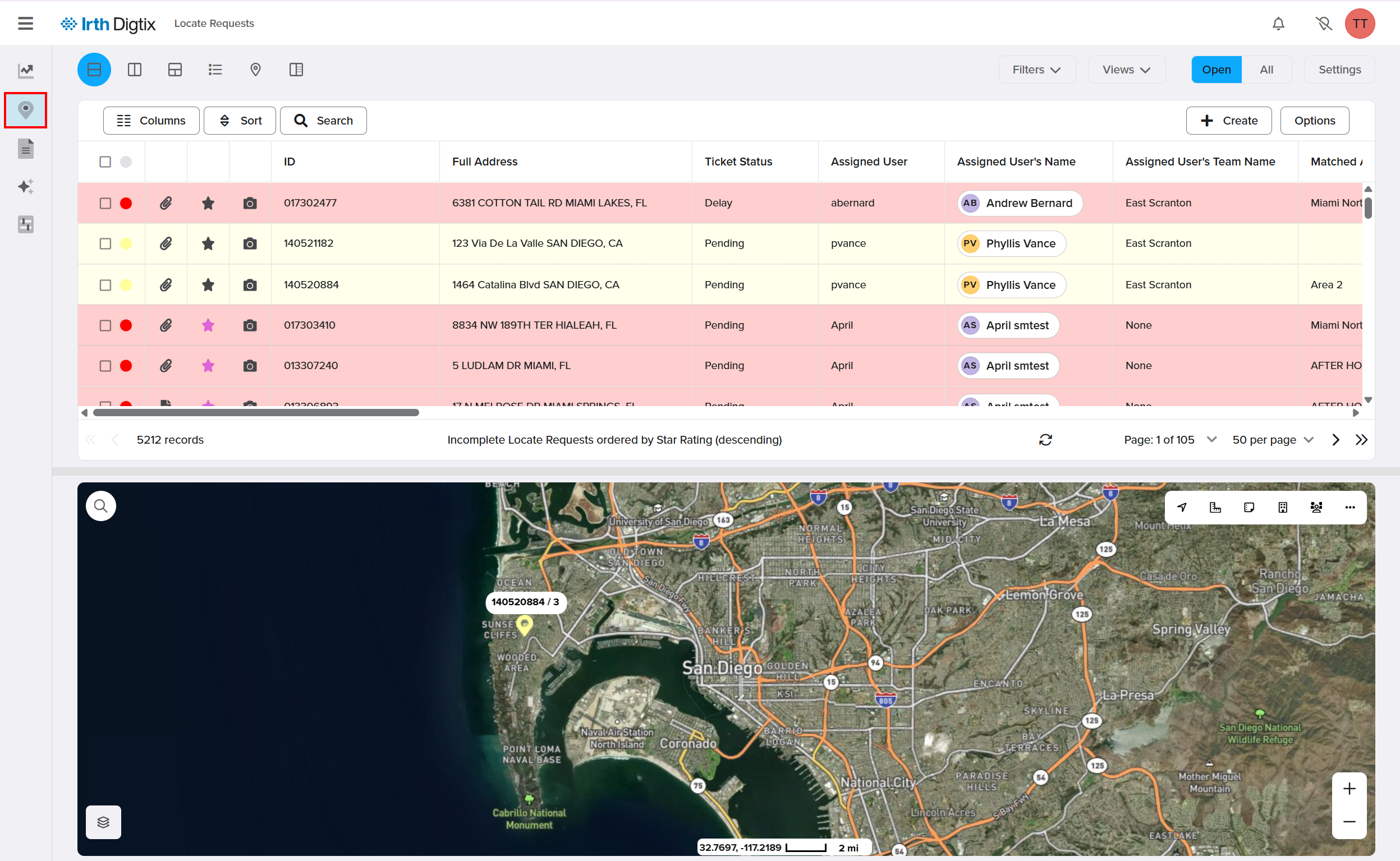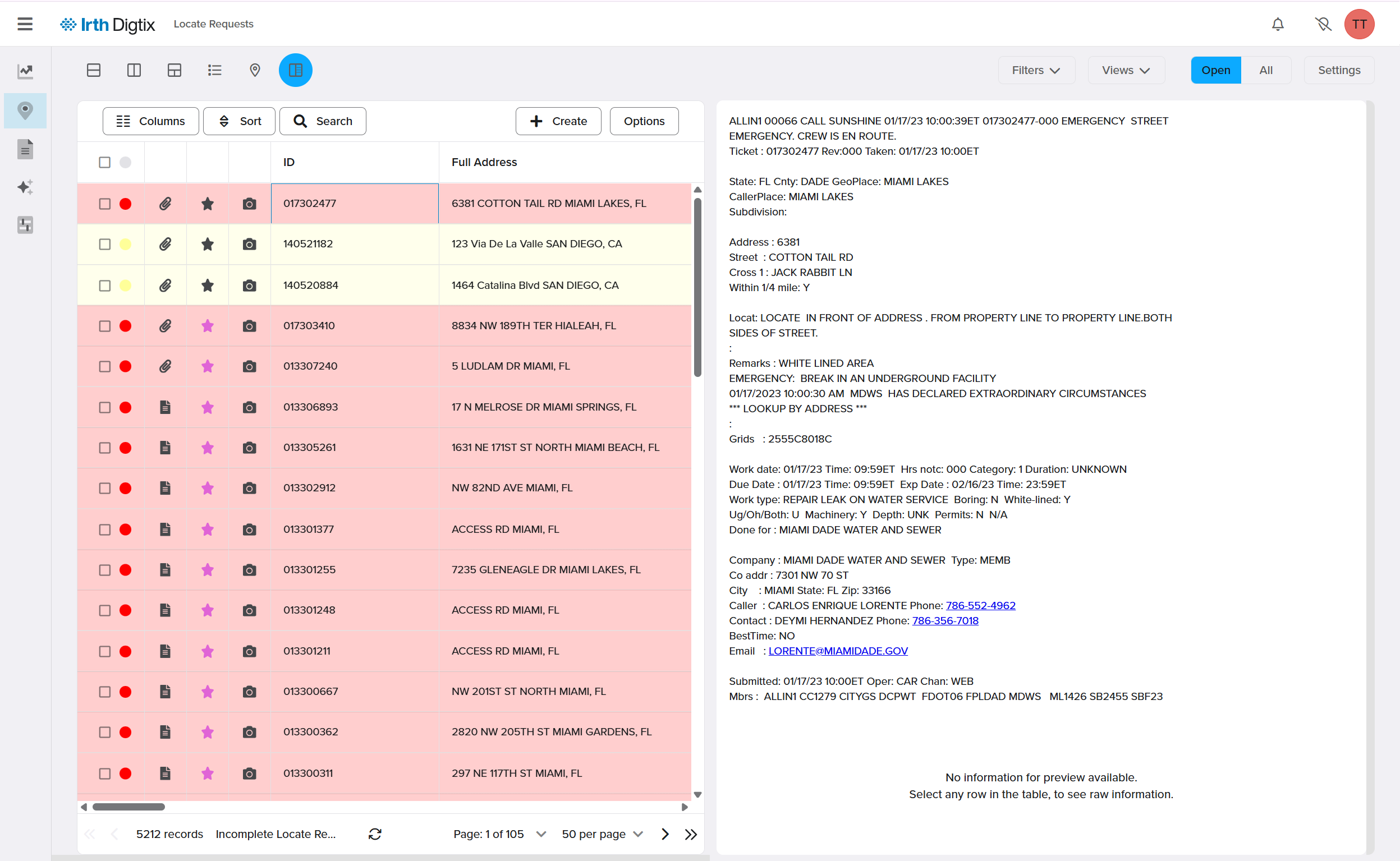 • Daily Locate Management: Quickly review and prioritize open locate requests using the grid and map views, helping reduce response times and missed deadlines.