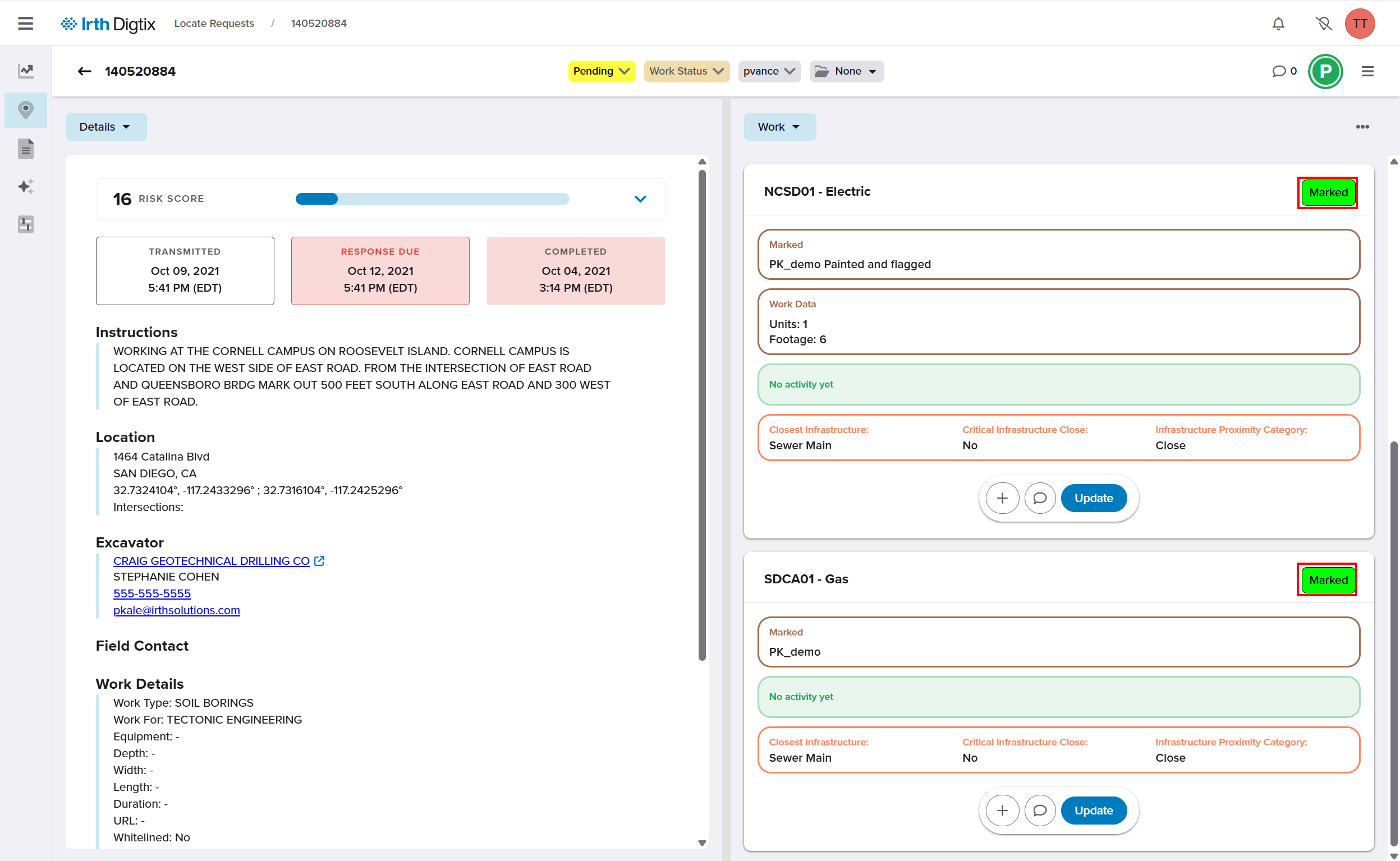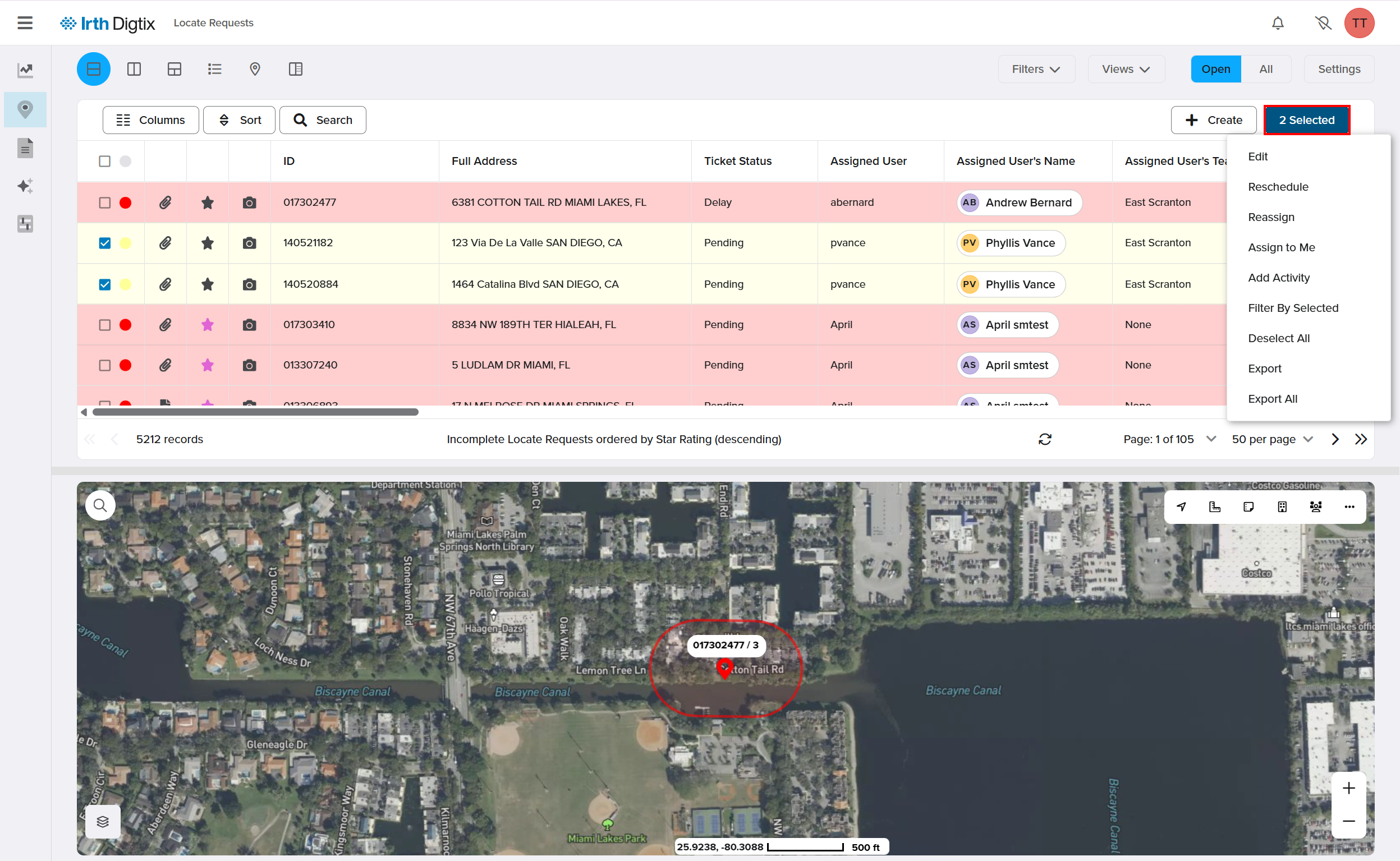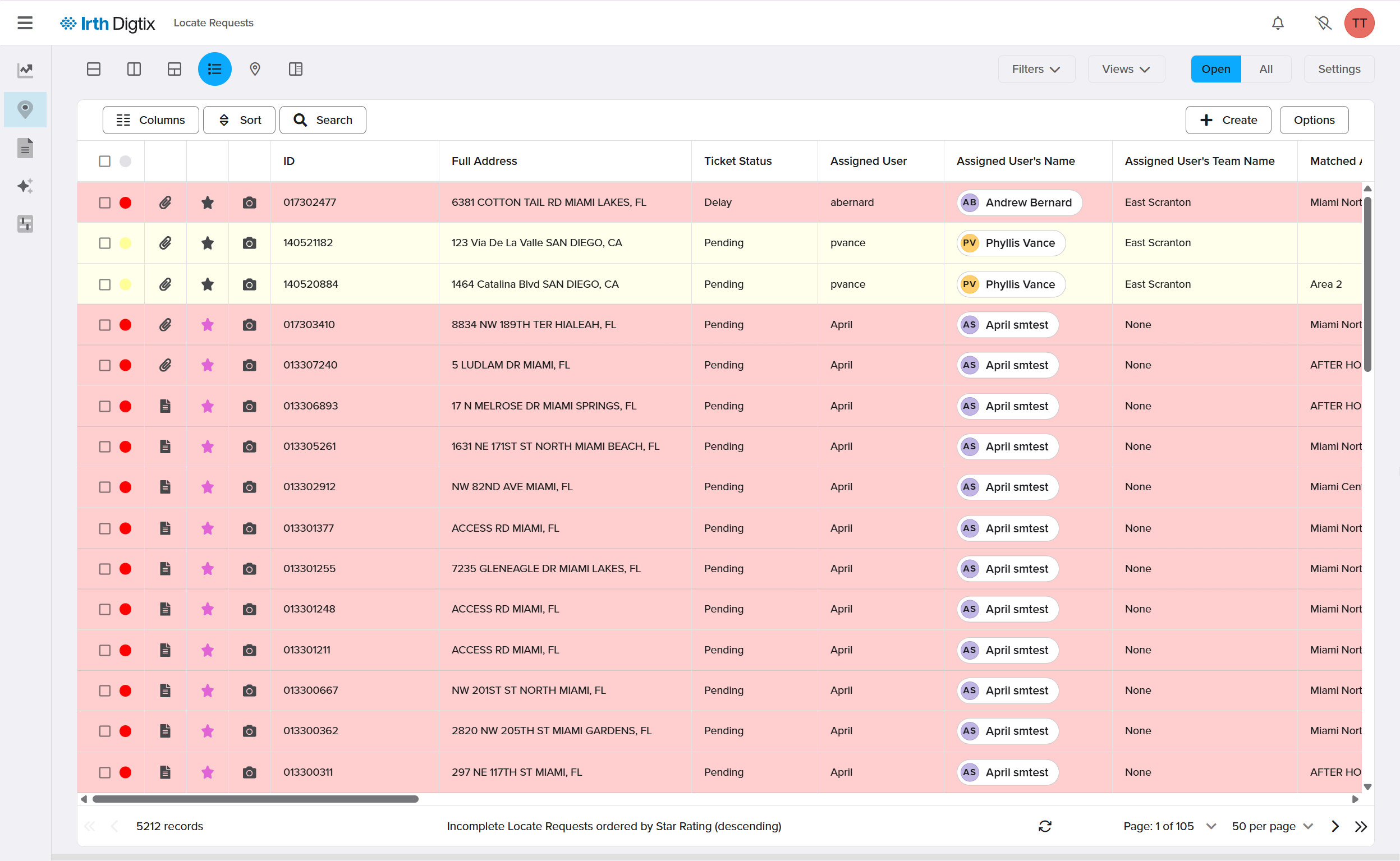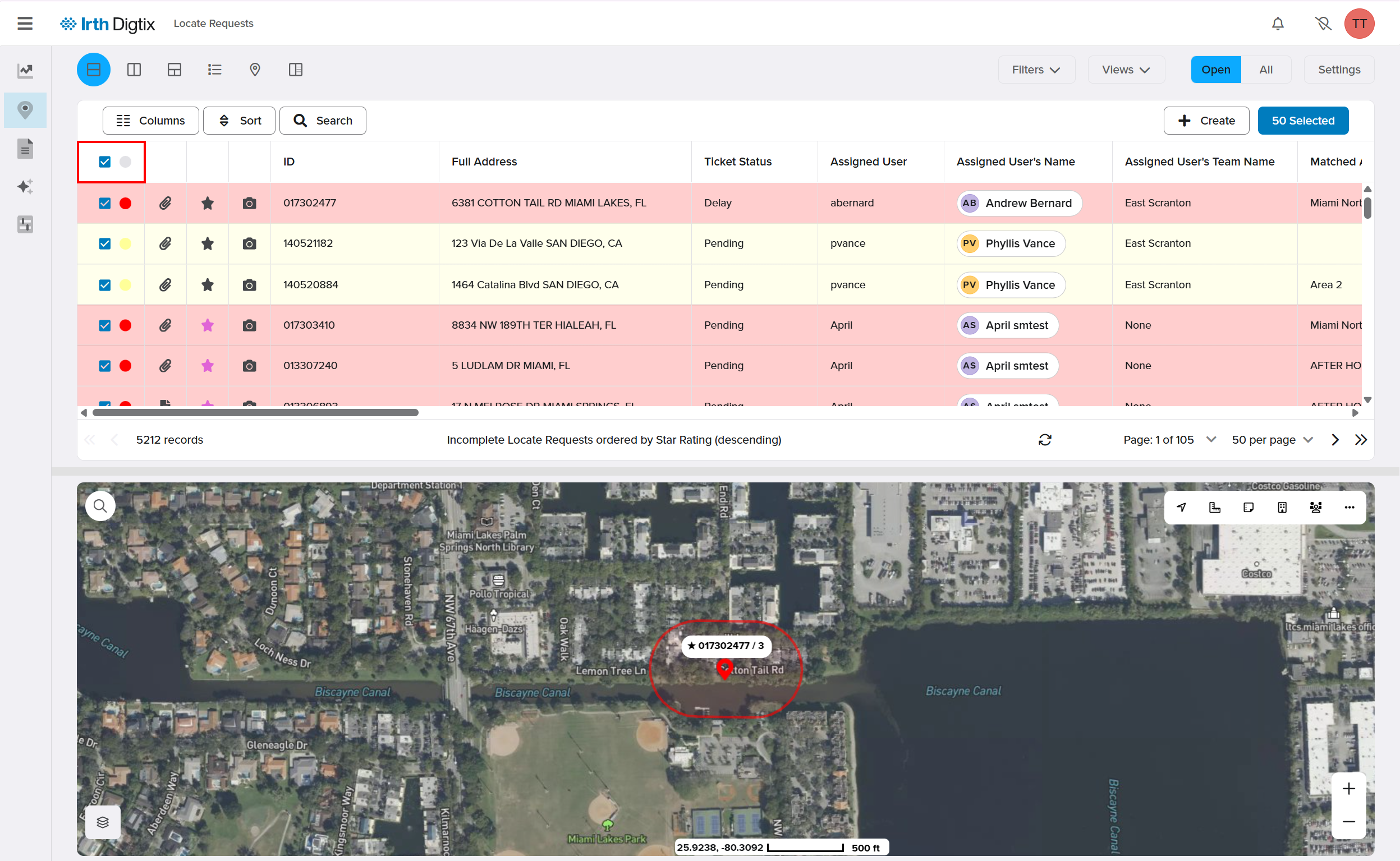 • Daily Locate Management: Quickly review and prioritize open locate requests using the grid and map views, helping reduce response times and missed deadlines.