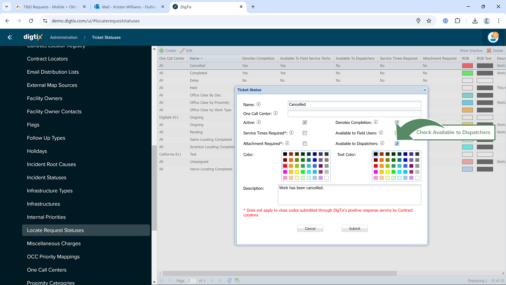 The final step in leveraging dispatchers within Digtix is to configure which statuses are available to the dispatch users. Typically these statuses include "Cleared", "Cleared by Proximity", "Cleared by Work Type", "Cleared by Excavator", or similar. These statuses will be presented as options for dispatch users to screen a ticket. To make a ticket status available to dispatch users, navigate to "Locate Request Statuses" in the "Admin" menu, select or create a Status, check the "Available to Dispatchers" checkbox on the ticket status configuration window, and select "Submit".