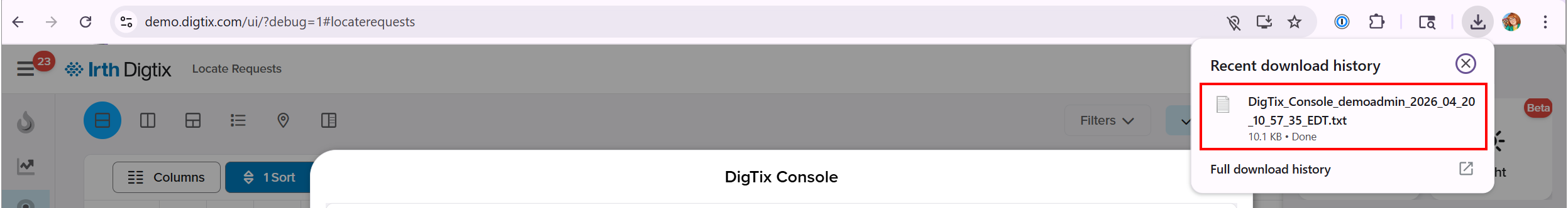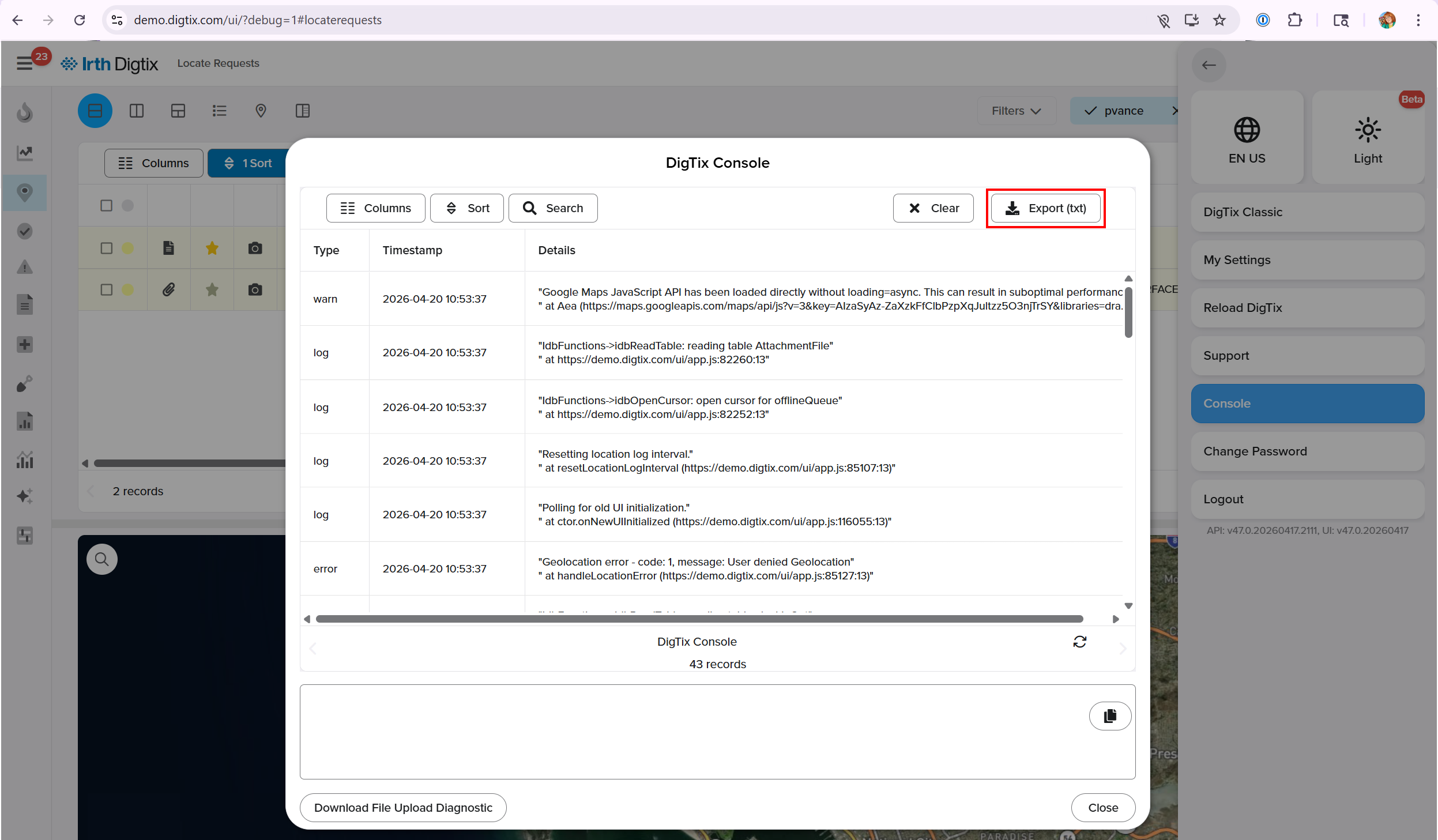In this article, you’ll learn how to access and export the Technical Console in Digtix. The Technical Console is used to collect diagnostic and technical information from a client device when troubleshooting issues or analyzing system behavior. This feature is primarily intended for administrators, support teams, or users assisting with issue investigation, and it provides a straightforward way to capture relevant logs for further analysis.
