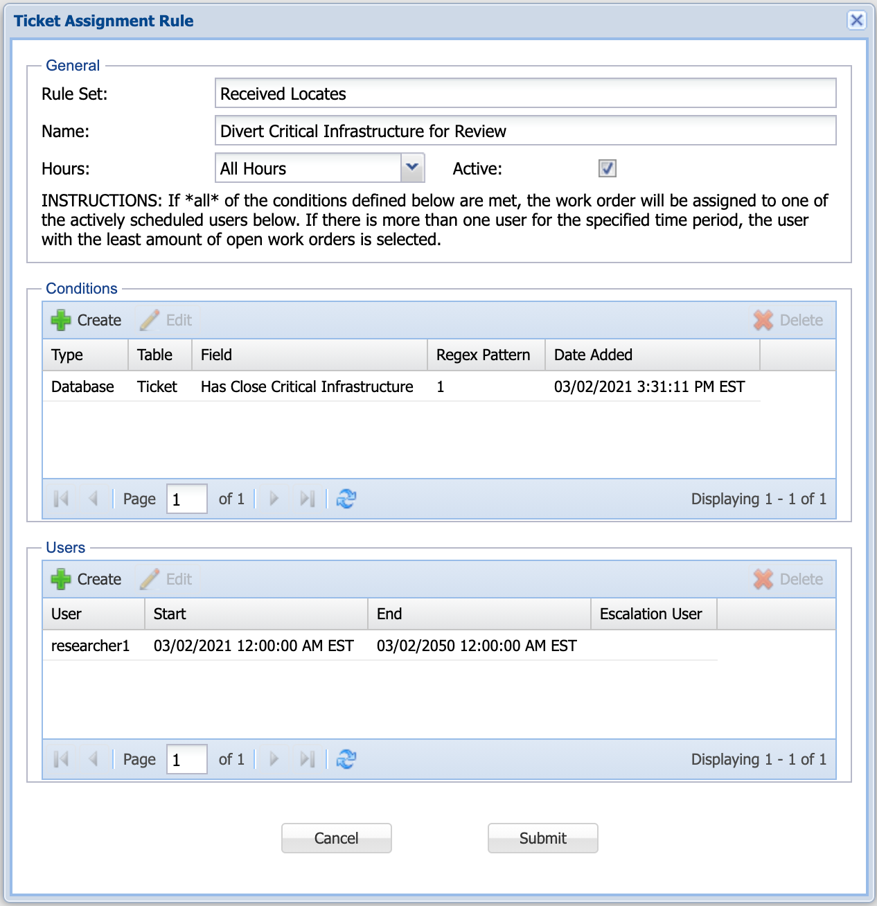 The new "Critical Infrastructure Close" field may also be used as a condition when defining assignment rules. In this way, all locate requests involving a critical asset can be assigned to a user (with an optional alert) for careful review before dispatching to the field.