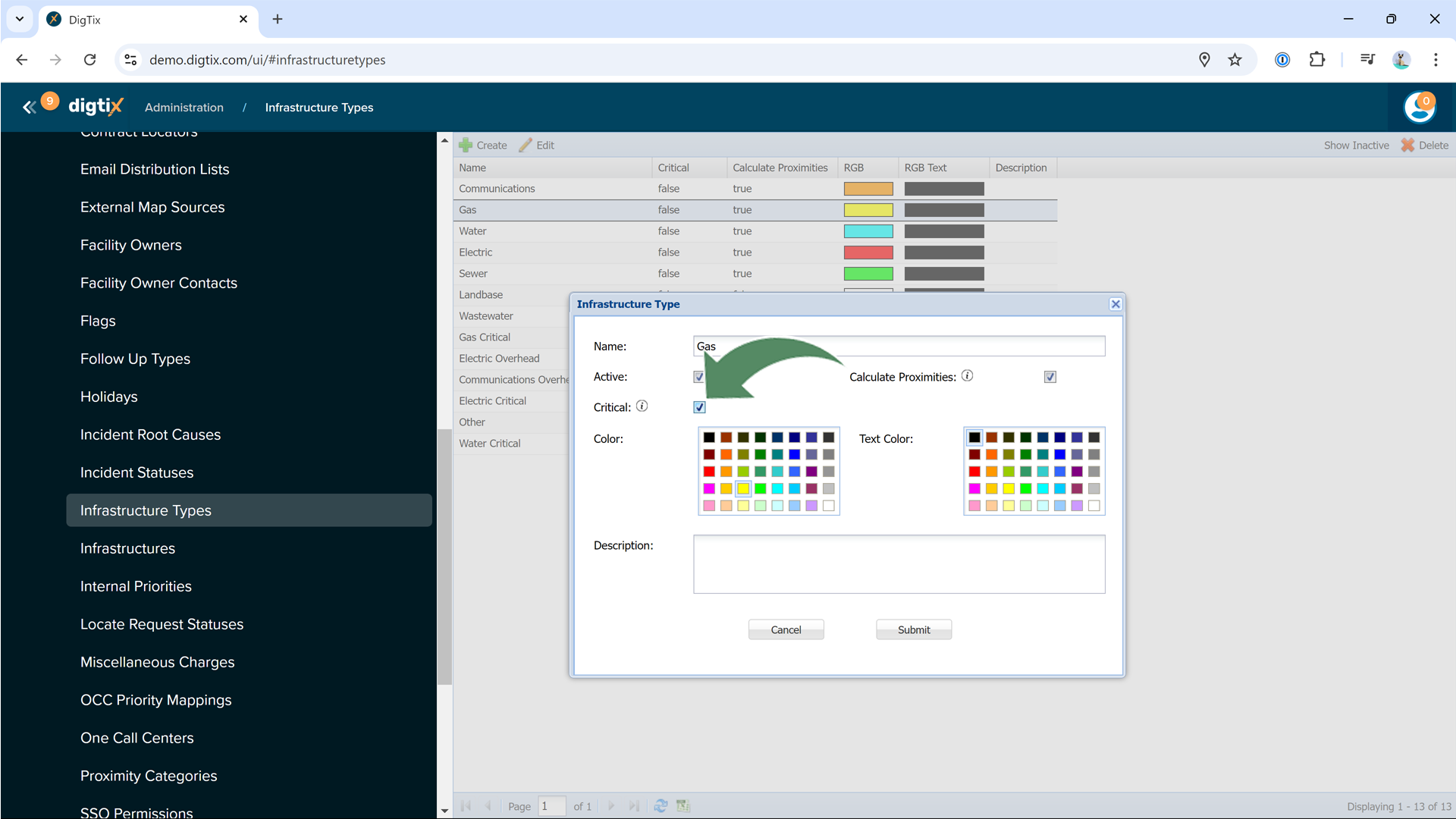 Designating infrastructures as critical provides Digtix the ability to determine if critical assets are in the scope of a locate request. This allows Digtix users to efficiently identify and prioritize high-impact locate requests.