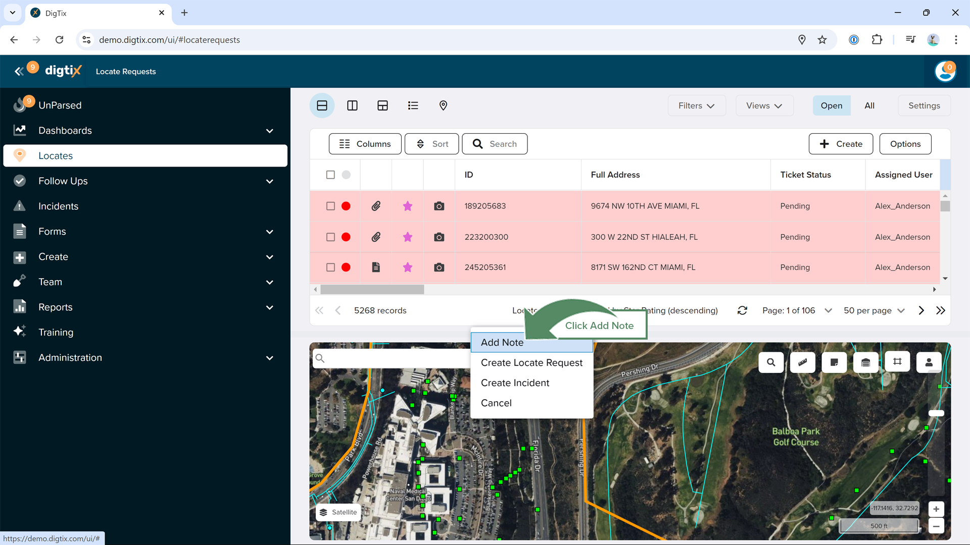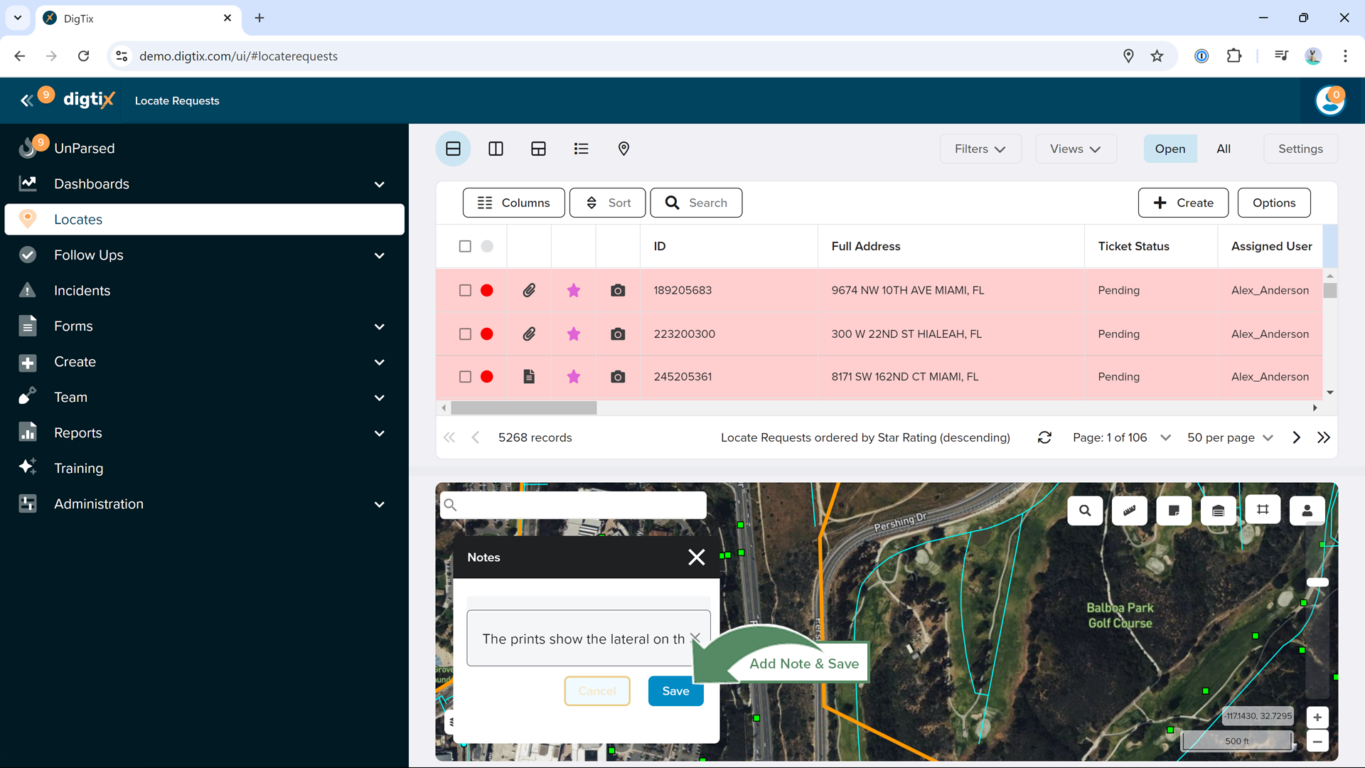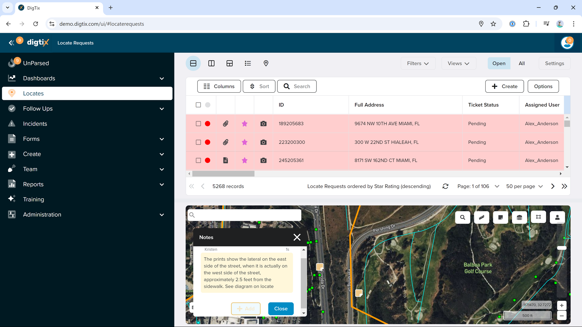 Utility locators have the opportunity to provide field feedback on the GIS data loaded into Digtix. This can be done by creating a map note at the location where data quality could be improved. This map note can be sent to an internal team for consideration. Upon review, the GIS data may be corrected to provide a higher level of data quality, thereby improving your organization's ability to quantify risk probability and consequence factors.