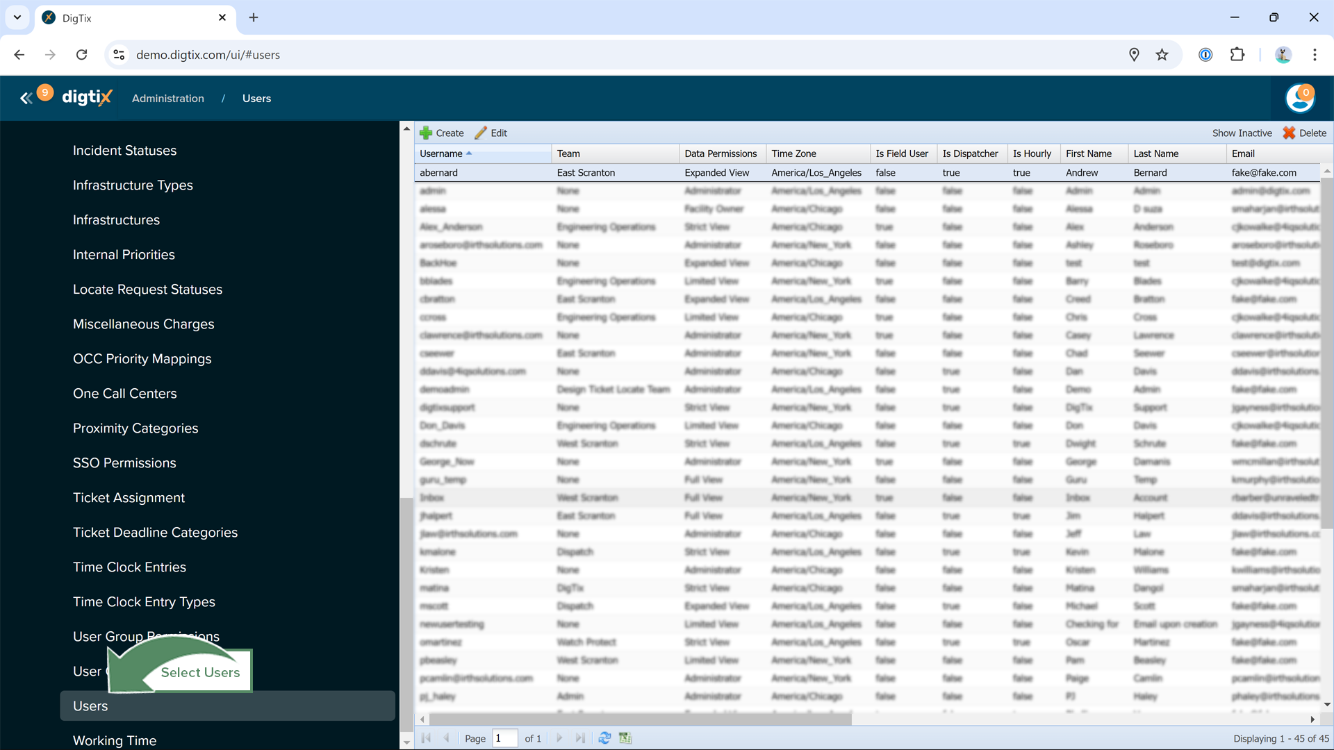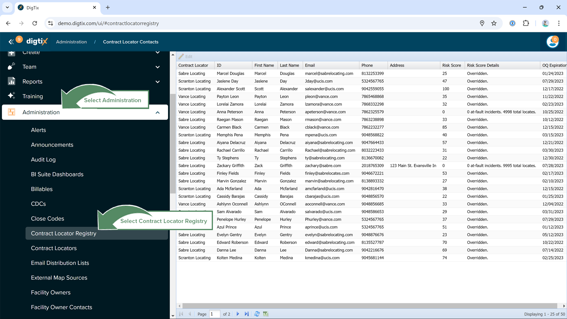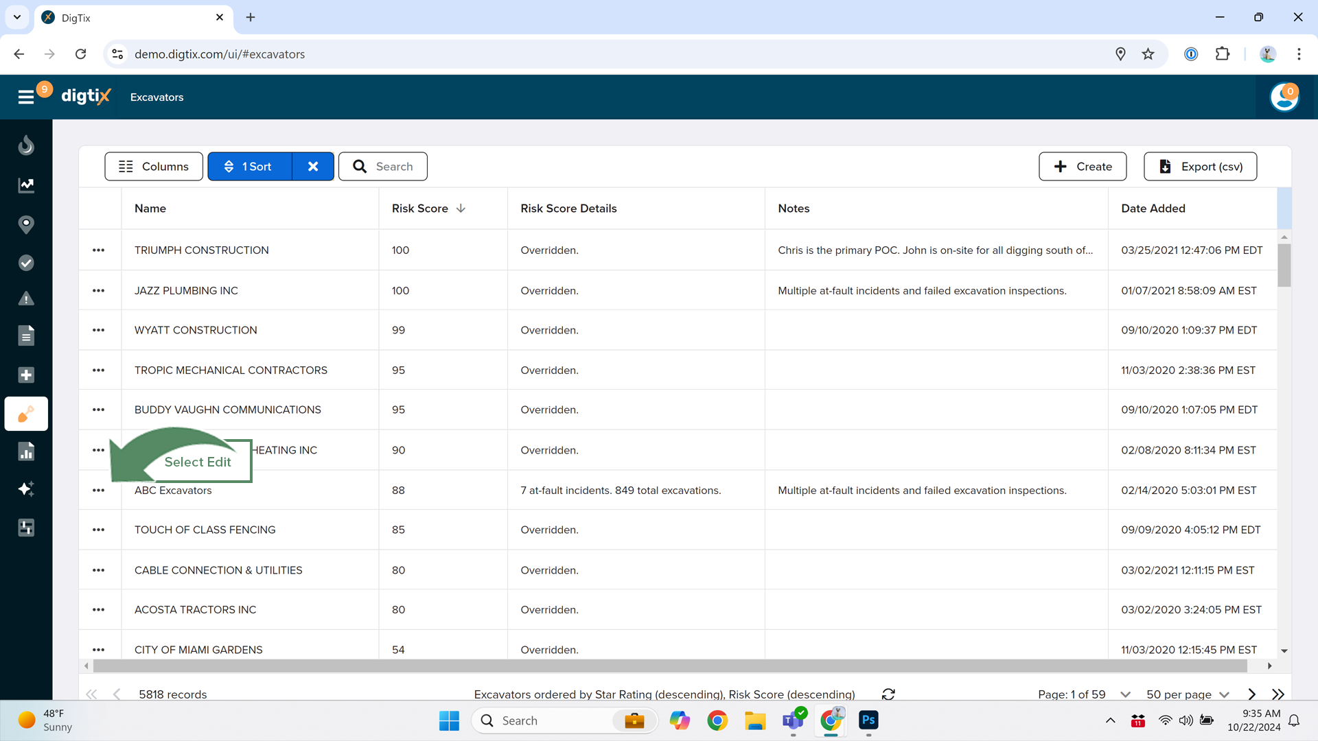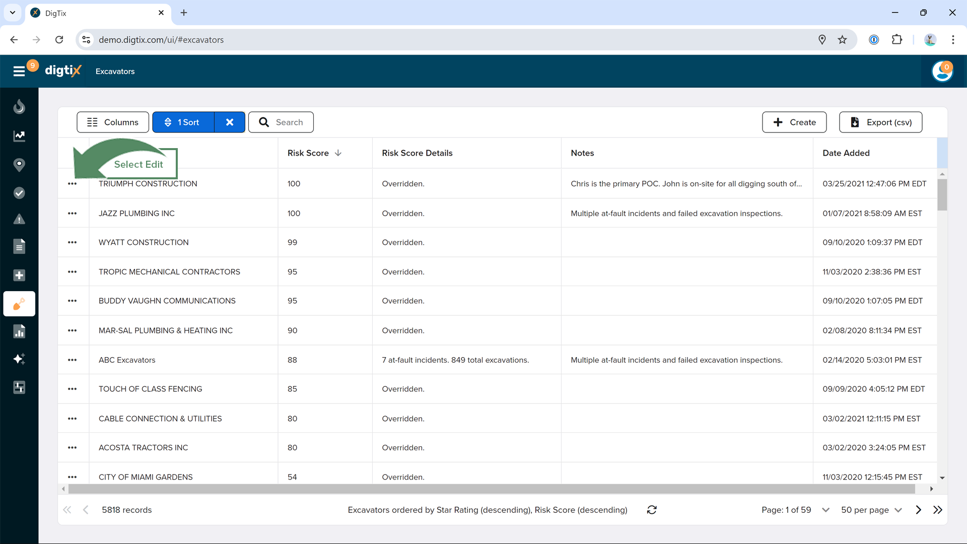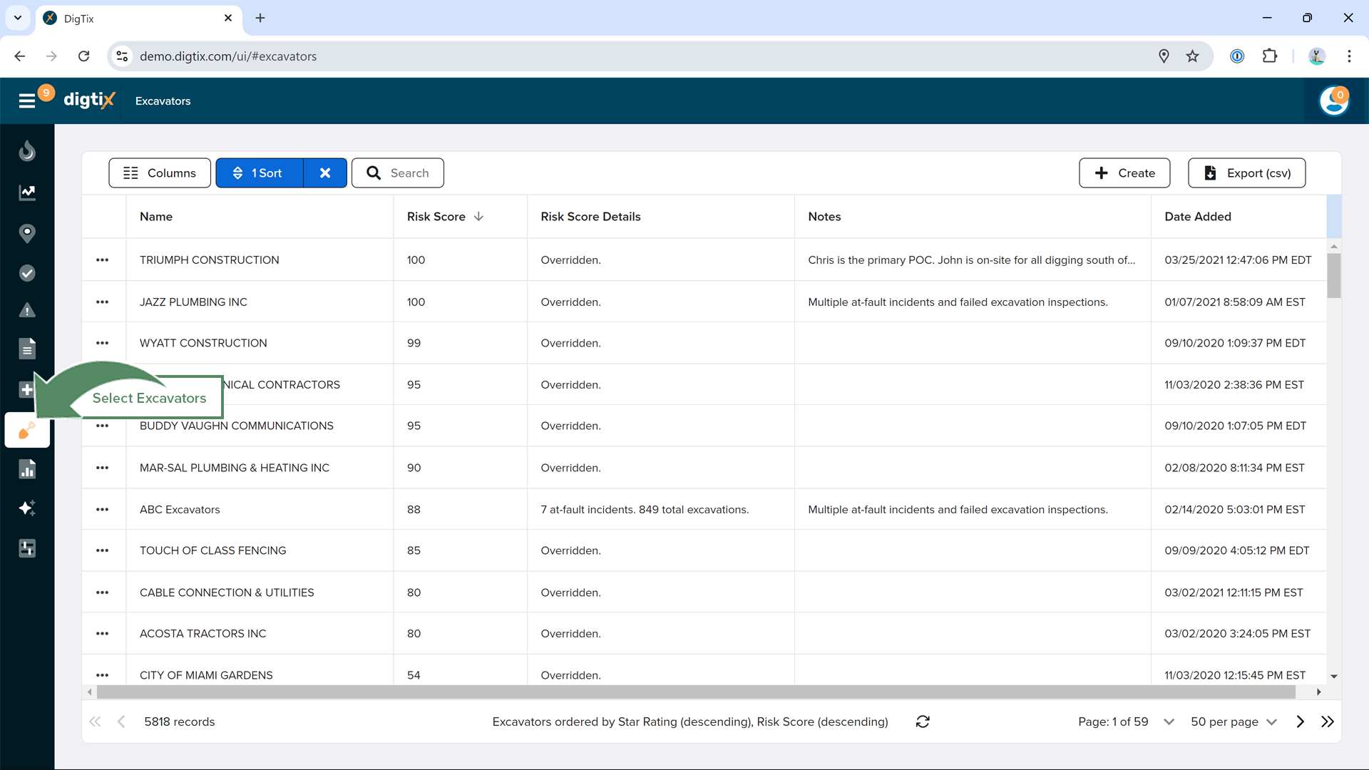 The "Excavators" page within Digtix provides a searchable registry of all excavators who have submitted a locate request or been involved in an incident. Digtix automatically calculates and maintains a risk score for every excavator based on past performance.