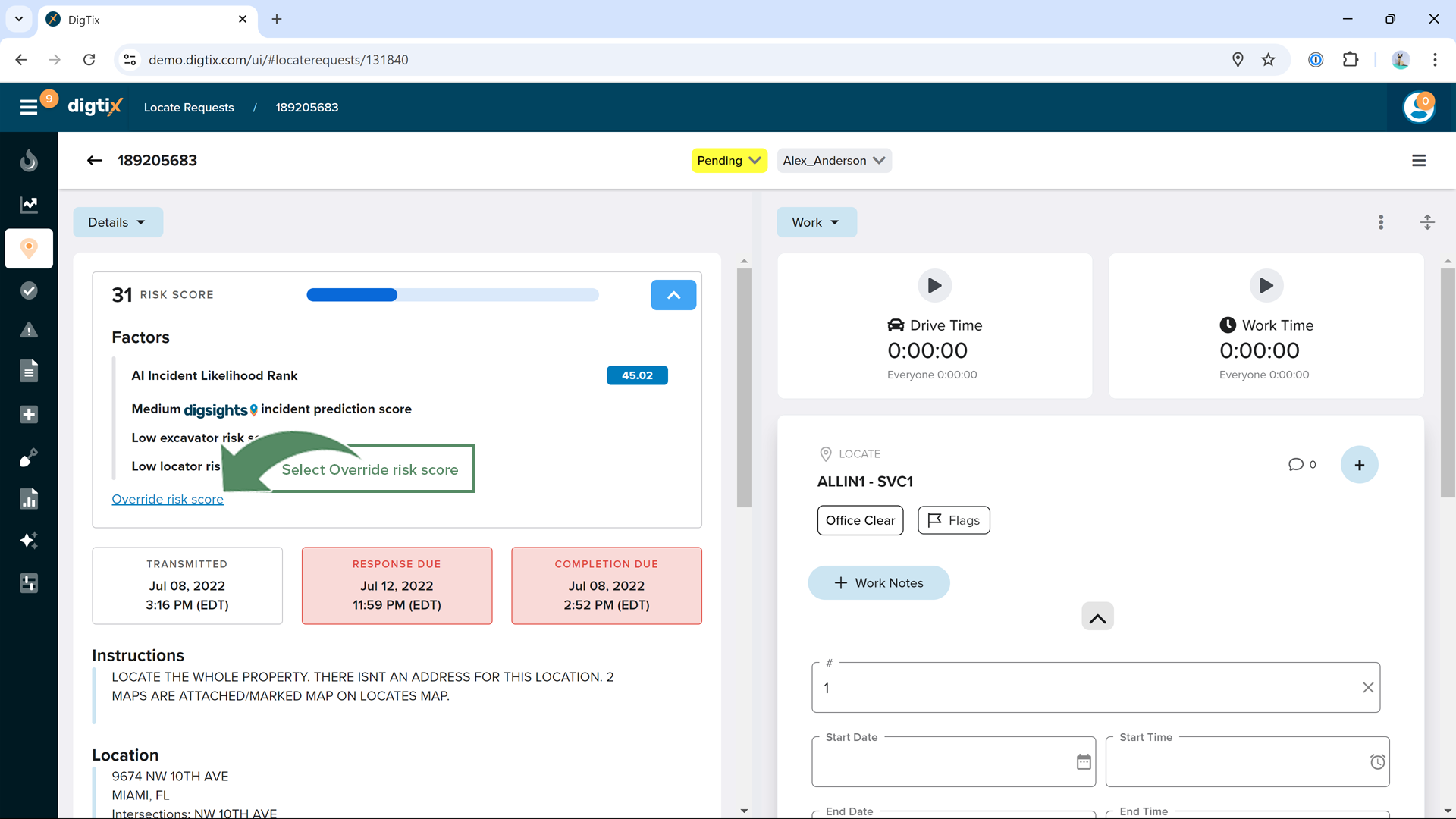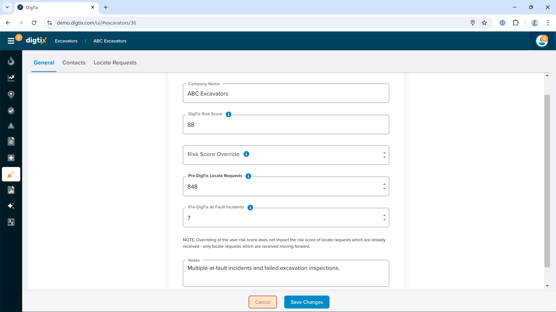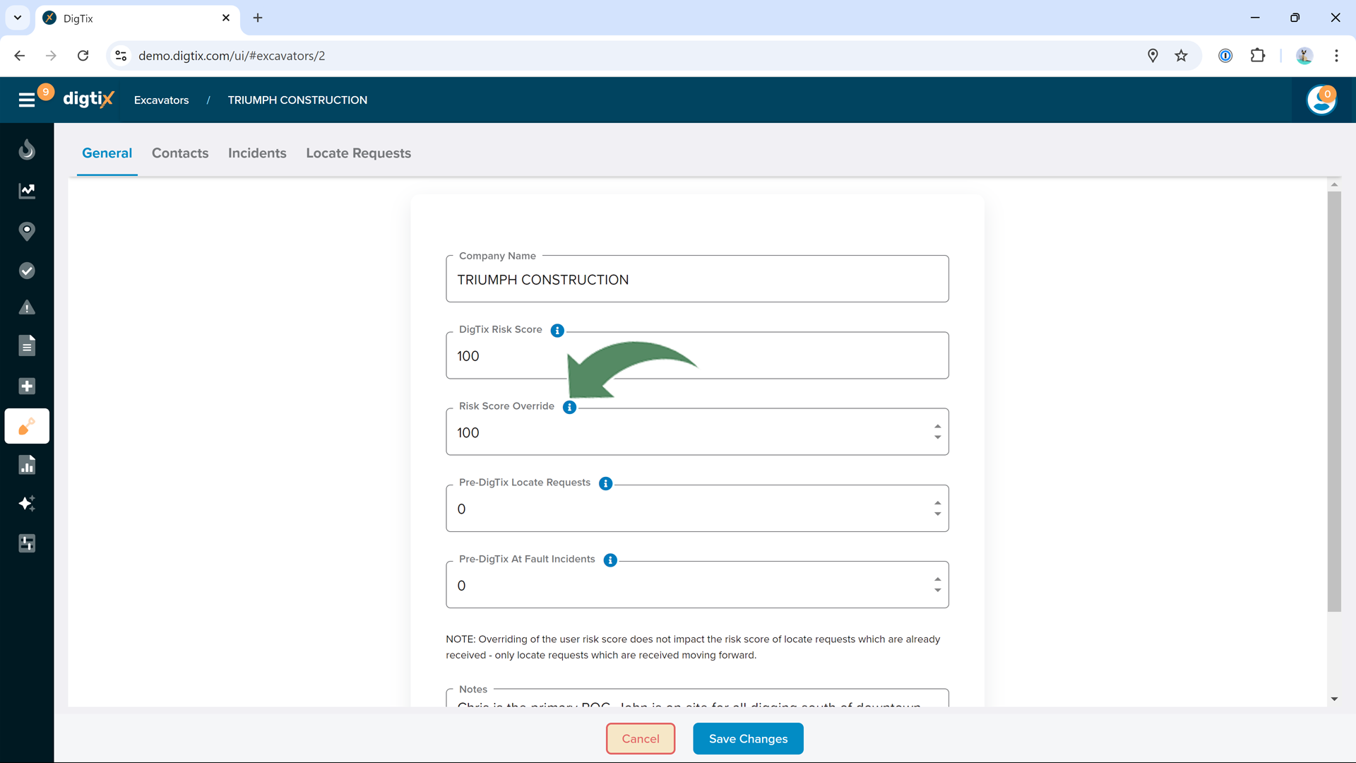 The excavator risk score may be manually overridden by providing a value in the "Risk Score Override" field for that excavator.