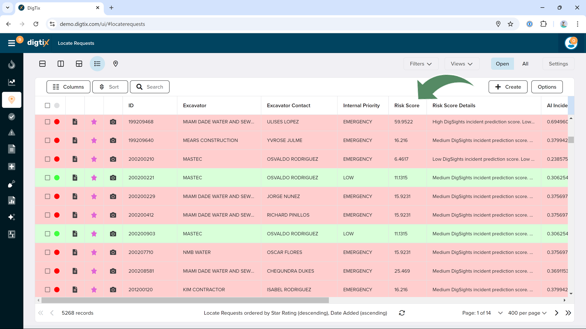 Locate request risk scores are displayed in the locate grid's "Risk Score" column. Similar to other columns, the "Risk Score" column can be filtered, sorted, hidden, or moved to create the desired data visualization.
