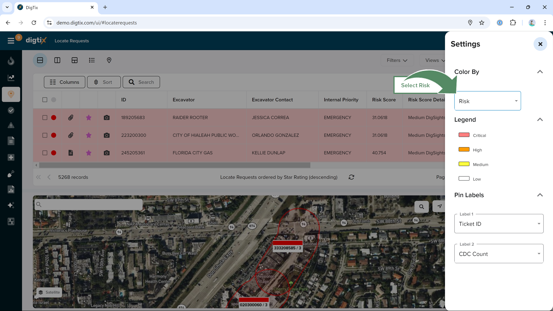 Locate request risk scores may be thematically mapped by selecting "Risk" in the "Color By" drop-down. This will color each locate request in the grid and on the map by the risk associated to each job.